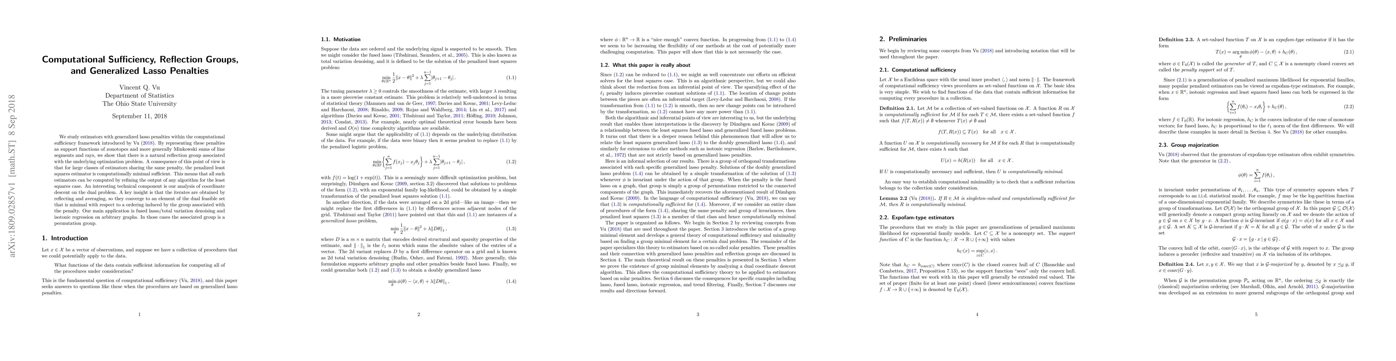 This paper explores estimators with generalized lasso penalties within the computational sufficiency framework, showing that these penalties can be represented as support functions of zonotopes. It demonstrates that a natural reflection group associated with the optimization problem leads to computationally minimal sufficient estimators.