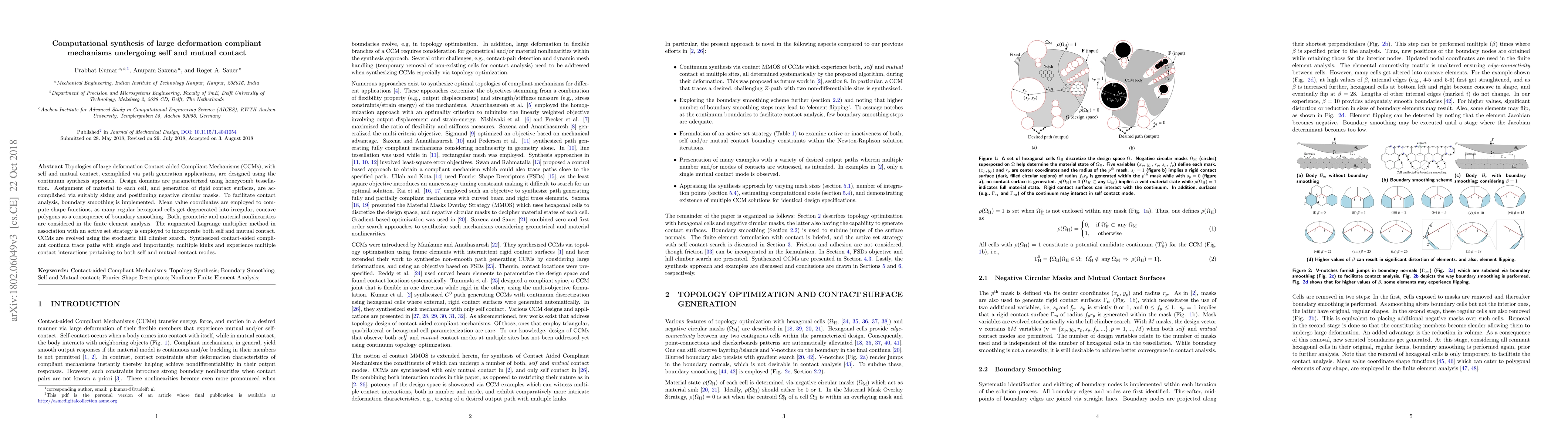Topologies of large deformation Contact-aided Compliant Mechanisms (CCMs), with self and mutual contact, exemplified via path generation applications, are designed using the continuum synthesis approach. Design domains are parameterized using honeycomb tessellation. Assignment of material to each cell, and generation of rigid contact surfaces, are accomplished via suitably sizing and positioning negative circular masks. To facilitate contact analysis, boundary smoothing is implemented. Mean value coordinates are employed to compute shape functions, as many regular hexagonal cells get degenerated into irregular, concave polygons as a consequence of boundary smoothing. Both, geometric and material nonlinearities are considered in the finite element analysis. The augmented Lagrange multiplier method in association with an active set strategy is employed to incorporate both self and mutual contact. CCMs are evolved using the stochastic hill climber search. Synthesized contact-aided compliant continua trace paths with single and importantly, multiple kinks and experience multiple contact interactions pertaining to both self and mutual contact modes.