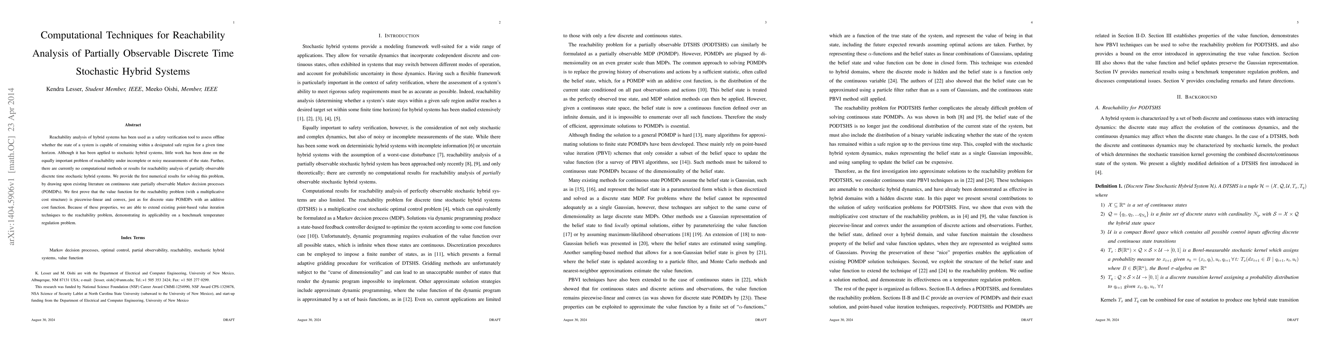 This paper introduces computational techniques for reachability analysis in partially observable discrete time stochastic hybrid systems, addressing the lack of methods for such scenarios. The authors extend point-based value iteration techniques from POMDPs, proving the value function's piecewise-linear and convex nature, and demonstrate the approach on a temperature regulation benchmark.