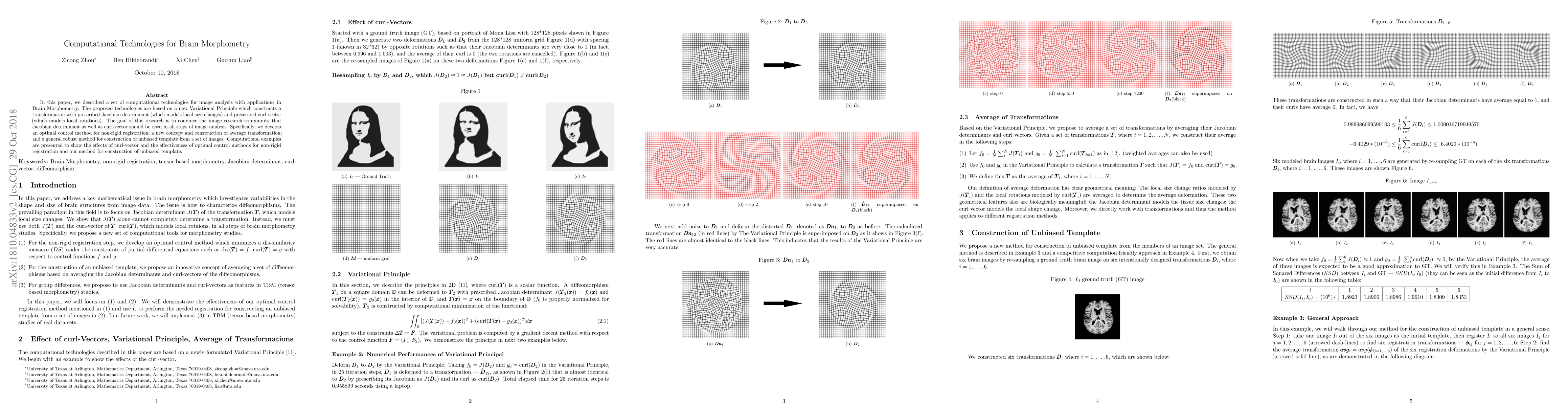 In this paper, we described a set of computational technologies for image analysis with applications in Brain Morphometry. The proposed technologies are based on a new Variational Principle which constructs a transformation with prescribed Jacobian determinant (which models local size changes) and prescribed curl-vector (which models local rotations). The goal of this research is to convince the image research community that Jacobian determinant as well as curl-vector should be used in all steps of image analysis. Specifically, we develop an optimal control method for non-rigid registration; a new concept and construction of average transformation; and a general robust method for construction of unbiased template from a set of images. Computational examples are presented to show the effects of curl-vector and the effectiveness of optimal control methods for non-rigid registration and our method for construction of unbiased template.