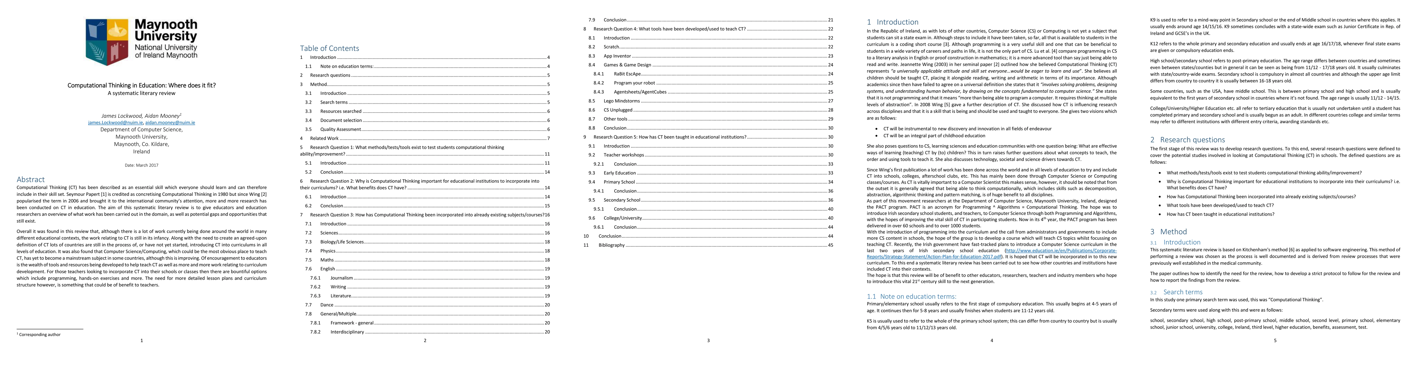 A systematic review of computational thinking (CT) in education found that CT is still in its infancy with many countries lacking a defined curriculum or teaching methods. Despite this, there are numerous tools and resources available to help incorporate CT into educational settings.