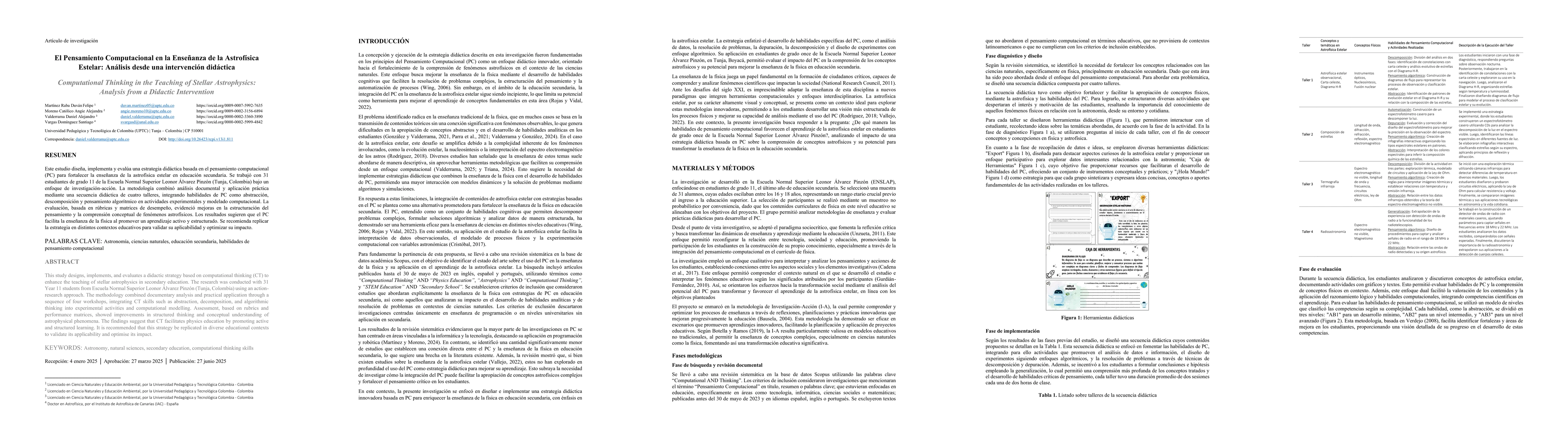 This study designs, implements, and evaluates a teaching strategy based on computational thinking (CT) 27 to strengthen the teaching of stellar astrophysics in secondary education. Thirty-one 11th-grade students 28 from the Escuela Normal Superior Leonor \'Alvarez Pinz\'on (Tunja, Colombia) were worked with using an 29 action research approach. The methodology combined documentary analysis and practical application 30 through a teaching sequence of four workshops, integrating CT skills such as abstraction, decomposition, 31 and algorithmic thinking in experimental activities and computational modeling. The evaluation, based on 32 rubrics and performance matrices, showed improvements in the structuring of thinking and conceptual 33 understanding of astrophysical phenomena. The results suggest that CP facilitates the teaching of physics 34 by promoting active and structured learning. It is recommended that the strategy be replicated in different 35 educational contexts to validate its applicability and optimize its impact.