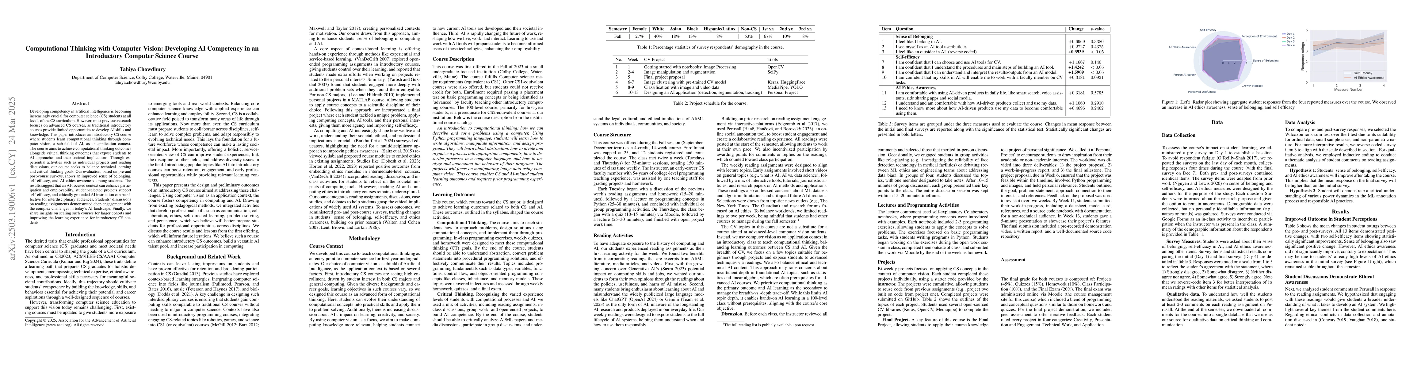 This course integrates computer vision into an introductory computer science curriculum to foster computational thinking and AI competency through hands-on projects, discussions, and readings on AI ethics and societal implications.
