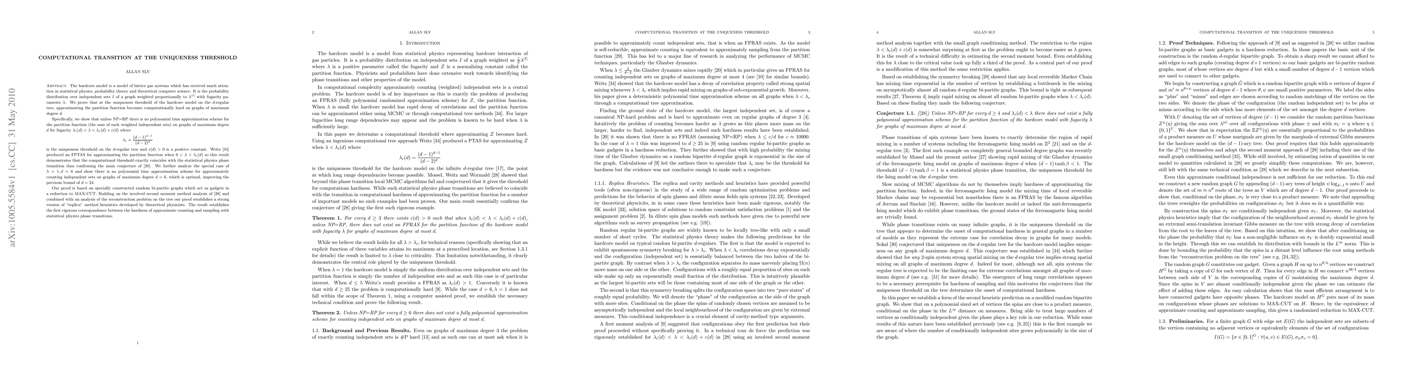 The hardcore model is a model of lattice gas systems which has received much attention in statistical physics, probability theory and theoretical computer science. It is the probability distribution over independent sets $I$ of a graph weighted proportionally to $\lambda^{|I|}$ with fugacity parameter $\lambda$. We prove that at the uniqueness threshold of the hardcore model on the $d$-regular tree, approximating the partition function becomes computationally hard on graphs of maximum degree $d$. Specifically, we show that unless NP$=$RP there is no polynomial time approximation scheme for the partition function (the sum of such weighted independent sets) on graphs of maximum degree $d$ for fugacity $\lambda_c(d) < \lambda < \lambda_c(d) + \epsilon(d)$ where $\lambda_c = \frac{(d-1)^{d-1}}{(d-2)^d}$ is the uniqueness threshold on the $d$-regular tree and $\epsilon(d)>0$. Weitz produced an FPTAS for approximating the partition function when $0<\lambda < \lambda_c(d)$ so this result demonstrates that the computational threshold exactly coincides with the statistical physics phase transition thus confirming the main conjecture of [28]. We further analyze the special case of $\lambda=1, d=6$ and show there is no polynomial time algorithm for approximately counting independent sets on graphs of maximum degree $d= 6$ which is optimal. Our proof is based on specially constructed random bi-partite graphs which act as gadgets in a reduction to MAX-CUT. Building on the second moment method analysis of [28] and combined with an analysis of the reconstruction problem on the tree our proof establishes a strong version of 'replica' method heuristics developed by theoretical physicists. The result establishes the first rigorous correspondence between the hardness of approximate counting and sampling with statistical physics phase transitions.