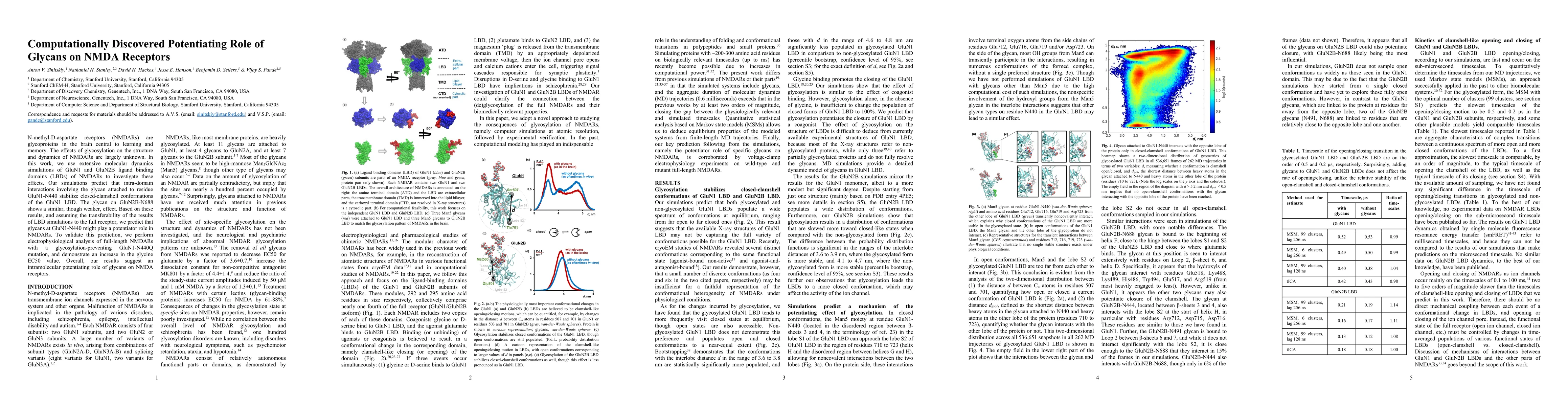 This study uses molecular dynamics simulations to explore the impact of glycosylation on NMDA receptors, revealing that glycans at specific residues stabilize closed-clamshell conformations of the receptor's ligand binding domains. Electrophysiological analysis confirms the potentiating role of glycans at GluN1-N440 in NMDAR function.