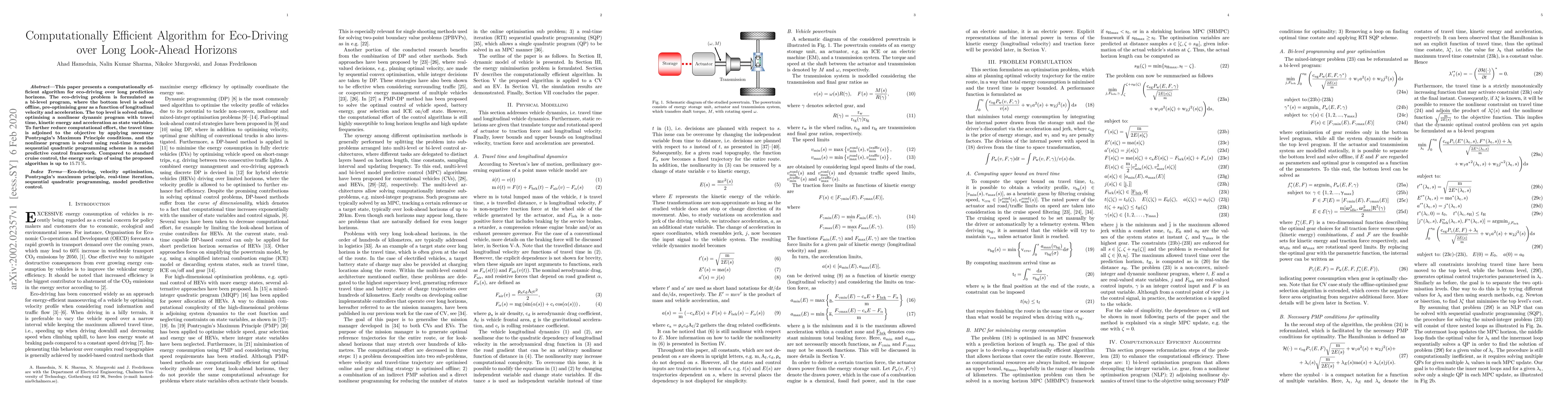 This paper presents a computationally efficient algorithm for eco-driving over long prediction horizons. The eco-driving problem is formulated as a bi-level program, where the bottom level is solved offline, pre-optimizing gear as a function of longitudinal velocity and acceleration. The top level is solved online, optimizing a nonlinear dynamic program with travel time, kinetic energy and acceleration as state variables. To further reduce computational effort, the travel time is adjoined to the objective by applying necessary Pontryagin Maximum Principle conditions, and the nonlinear program is solved using real-time iteration sequential quadratic programming scheme in a model predictive control framework. Compared to standard cruise control, the energy savings of using the proposed algorithm is up to 15.71%.