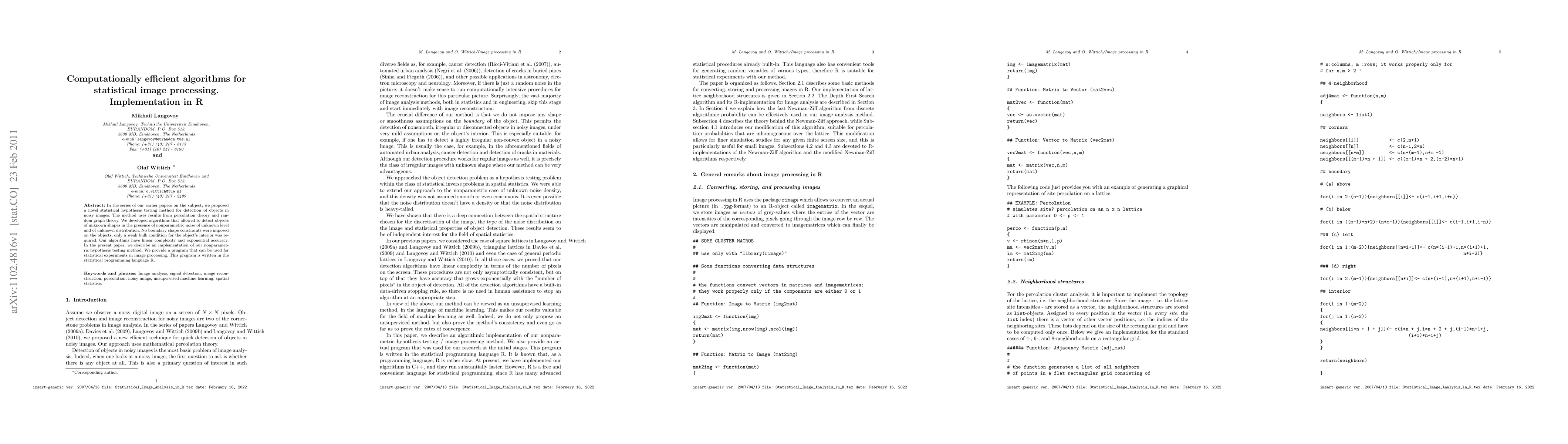 This paper presents an R implementation of a computationally efficient statistical image processing method. The method, based on percolation and random graph theories, detects objects of unknown shapes in noisy images with linear complexity and exponential accuracy, requiring only a weak bulk condition for the object's interior.