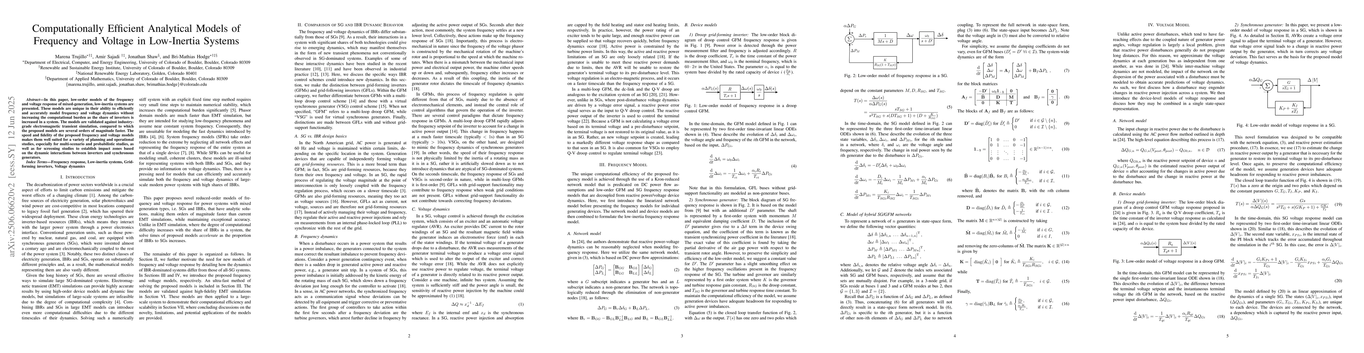 In this paper, low-order models of the frequency and voltage response of mixed-generation, low-inertia systems are presented. These models are unique in their ability to efficiently and accurately model frequency and voltage dynamics without increasing the computational burden as the share of inverters is increased in a system. The models are validated against industry-grade electromagnetic transient simulation, compared to which the proposed models are several orders of magnitude faster. The accuracy and efficiency of the low-inertia frequency and voltage models makes them well suited for a variety of planning and operational studies, especially for multi-scenario and probabilistic studies, as well as for screening studies to establish impact zones based on the dynamic interactions between inverters and synchronous generators.