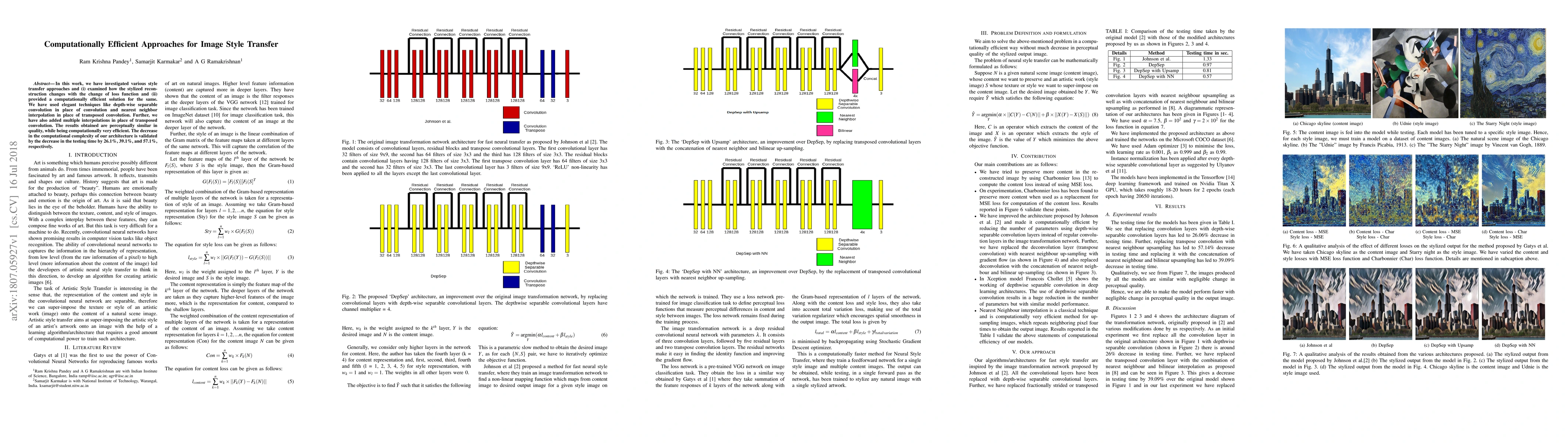 In this work, we have investigated various style transfer approaches and (i) examined how the stylized reconstruction changes with the change of loss function and (ii) provided a computationally efficient solution for the same. We have used elegant techniques like depth-wise separable convolution in place of convolution and nearest neighbor interpolation in place of transposed convolution. Further, we have also added multiple interpolations in place of transposed convolution. The results obtained are perceptually similar in quality, while being computationally very efficient. The decrease in the computational complexity of our architecture is validated by the decrease in the testing time by 26.1%, 39.1%, and 57.1%, respectively.