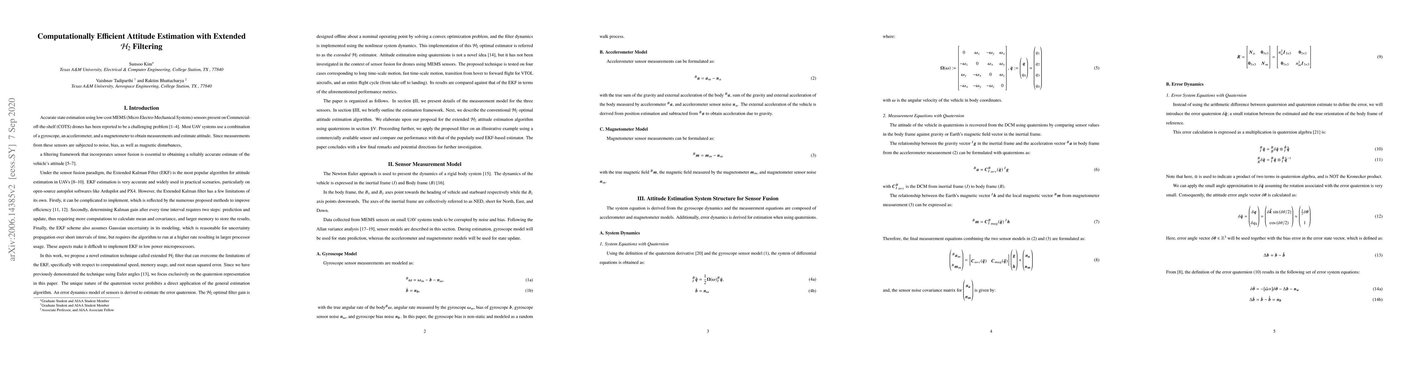 Accurate state estimation using low-cost MEMS (Micro Electro- Mechanical Systems) sensors present on Commercial-off-the-shelf (COTS) drones is a challenging problem. Most UAV systems use a combination of a gyroscope, an accelerometer, and a magnetometer to obtain measurements and estimate attitude. Under this paradigm of sensor fusion, the Extended Kalman Filter (EKF) is the most popular algorithm for attitude estimation in UAVs. In this work, we propose a novel estimation technique called extended H2 filter that can overcome the limitations of the EKF, specifically with respect to computational speed, memory usage, and root mean squared error. We formulate our attitude-estimation algorithm using unit quaternions. The H2 optimal filter gain is designed offline about a nominal operating point by solving a convex optimization problem, and the filter dynamics is implemented using the nonlinear system dynamics. This implementation of this H2 optimal estimator is referred as the extended H2 estimator. The proposed technique is tested on four cases corresponding to long time-scale motion, fast time-scale motion, transition from hover to forward flight for VTOL aircrafts, and an entire flight cycle (from take-off to landing). Its results are compared against that of the EKF in terms of the aforementioned performance metrics.