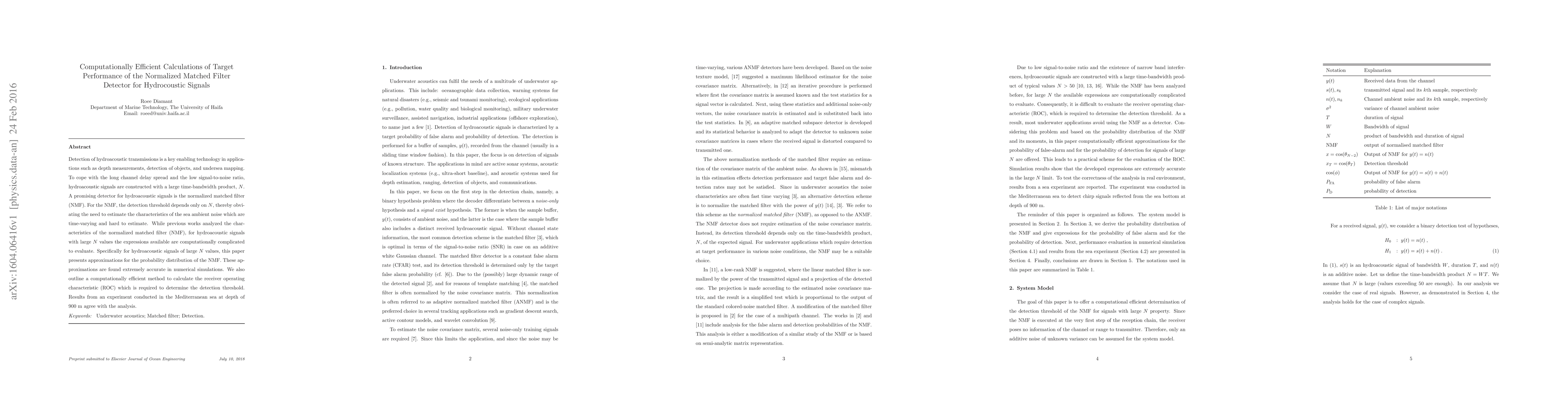 Detection of hydroacoustic transmissions is a key enabling technology in applications such as depth measurements, detection of objects, and undersea mapping. To cope with the long channel delay spread and the low signal-to-noise ratio, hydroacoustic signals are constructed with a large time-bandwidth product, $N$. A promising detector for hydroacoustic signals is the normalized matched filter (NMF). For the NMF, the detection threshold depends only on $N$, thereby obviating the need to estimate the characteristics of the sea ambient noise which are time-varying and hard to estimate. While previous works analyzed the characteristics of the normalized matched filter (NMF), for hydroacoustic signals with large $N$ values the expressions available are computationally complicated to evaluate. Specifically for hydroacoustic signals of large $N$ values, this paper presents approximations for the probability distribution of the NMF. These approximations are found extremely accurate in numerical simulations. We also outline a computationally efficient method to calculate the receiver operating characteristic (ROC) which is required to determine the detection threshold. Results from an experiment conducted in the Mediterranean sea at depth of 900~m agree with the analysis.