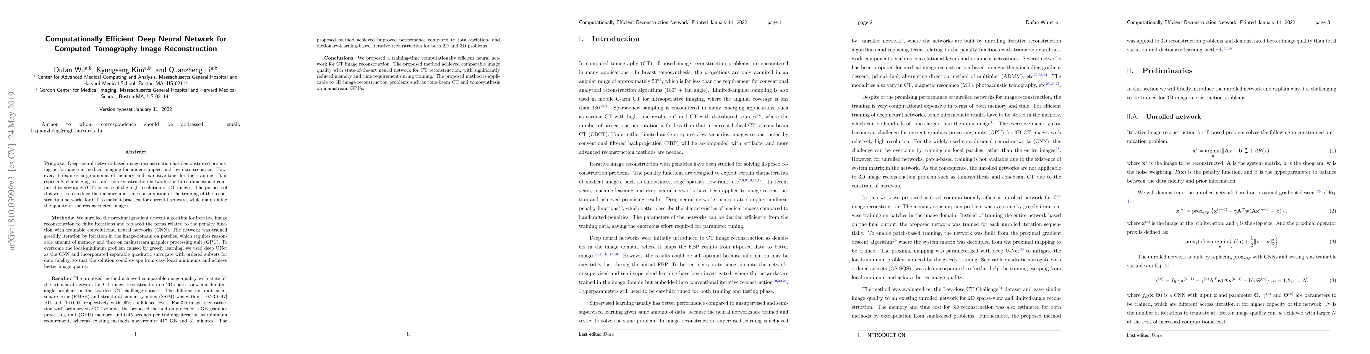 This paper proposes a computationally efficient deep neural network for CT image reconstruction, utilizing an unrolled proximal gradient descent algorithm with trainable CNNs to reduce memory and training time. The method achieves comparable image quality to state-of-the-art techniques while being practical for current hardware.