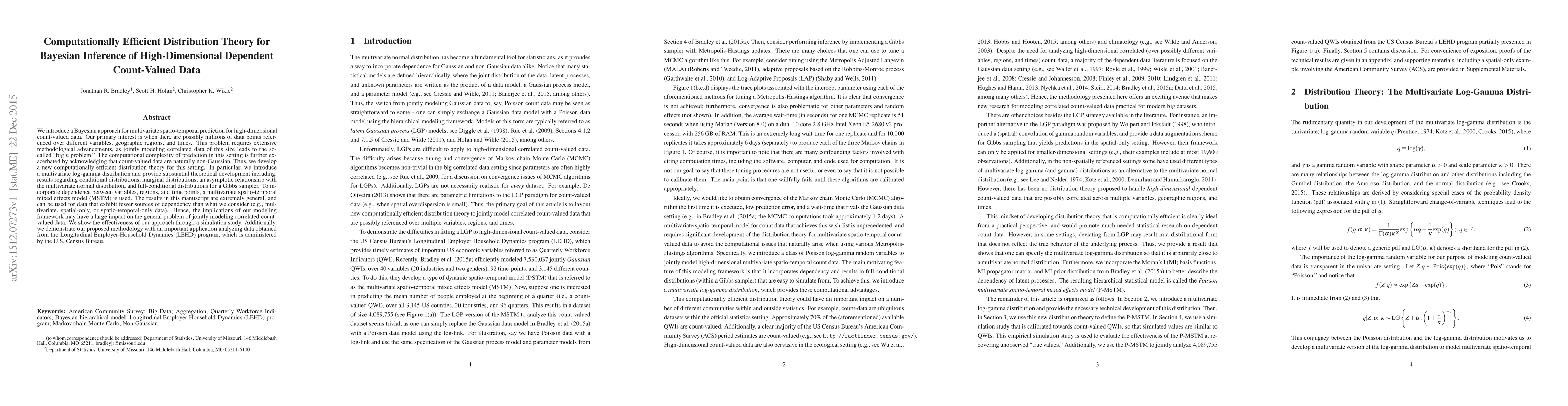 We introduce a Bayesian approach for multivariate spatio-temporal prediction for high-dimensional count-valued data. Our primary interest is when there are possibly millions of data points referenced over different variables, geographic regions, and times. This problem requires extensive methodological advancements, as jointly modeling correlated data of this size leads to the so-called "big n problem." The computational complexity of prediction in this setting is further exacerbated by acknowledging that count-valued data are naturally non-Gaussian. Thus, we develop a new computationally efficient distribution theory for this setting. In particular, we introduce a multivariate log-gamma distribution and provide substantial theoretical development including: results regarding conditional distributions, marginal distributions, an asymptotic relationship with the multivariate normal distribution, and full-conditional distributions for a Gibbs sampler. To incorporate dependence between variables, regions, and time points, a multivariate spatio-temporal mixed effects model (MSTM) is used. The results in this manuscript are extremely general, and can be used for data that exhibit fewer sources of dependency than what we consider (e.g., multivariate, spatial-only, or spatio-temporal-only data). Hence, the implications of our modeling framework may have a large impact on the general problem of jointly modeling correlated count-valued data. We show the effectiveness of our approach through a simulation study. Additionally, we demonstrate our proposed methodology with an important application analyzing data obtained from the Longitudinal Employer-Household Dynamics (LEHD) program, which is administered by the U.S. Census Bureau.