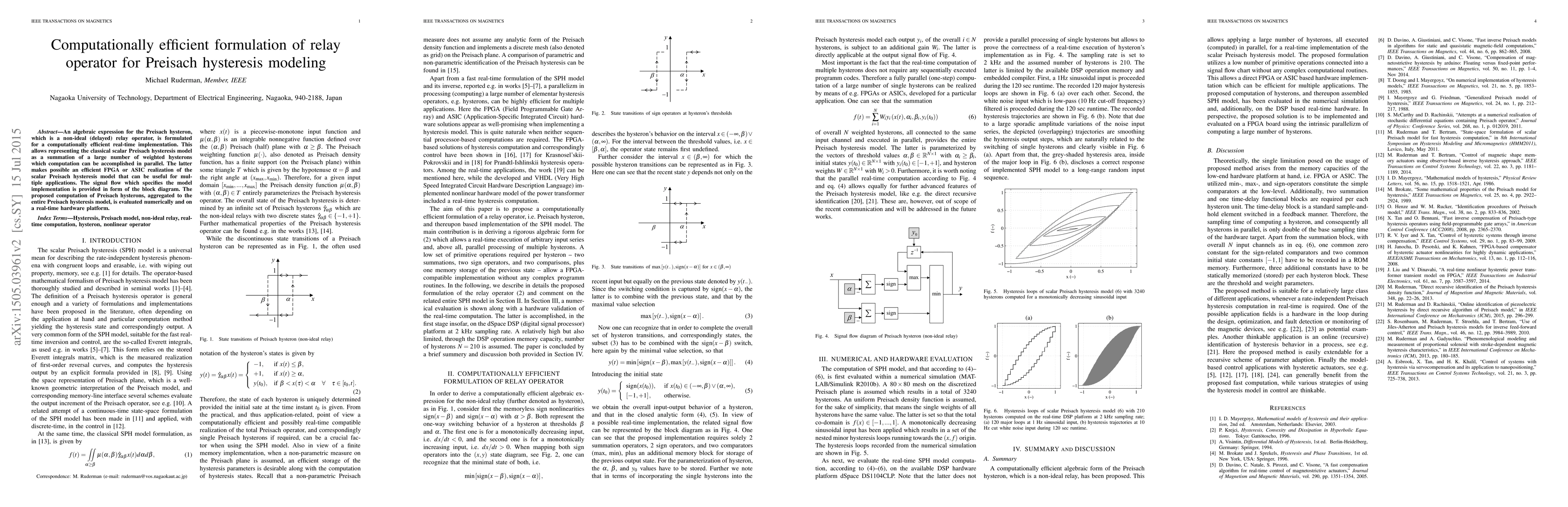 This paper presents an efficient algebraic expression for the Preisach hysteron to enable real-time computation of the Preisach hysteresis model, facilitating parallel processing and efficient FPGA or ASIC implementation. The proposed method is validated through numerical and hardware evaluations.