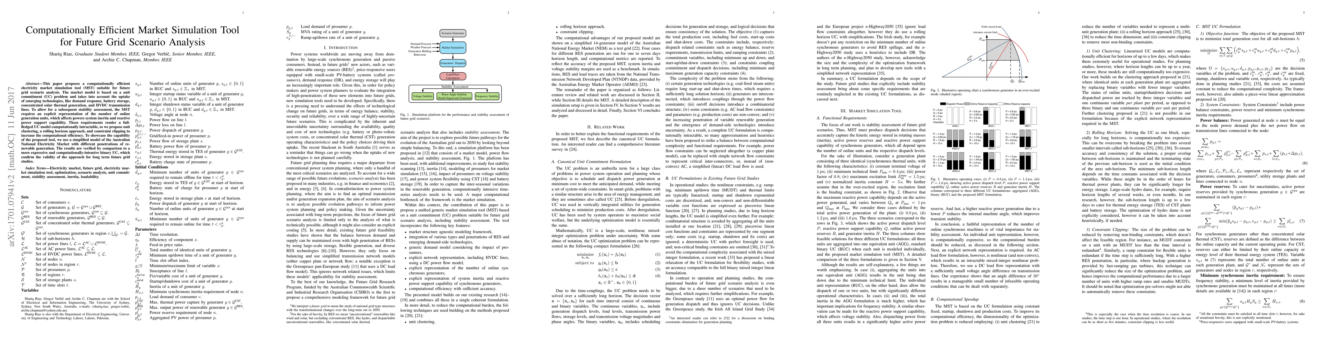 The paper introduces a computationally efficient electricity market simulation tool for future grid scenario analysis, employing unit clustering, rolling horizon, and constraint reduction to manage complexity. The tool's validity is demonstrated through its application to the Australian National Electricity Market, showing close results to detailed binary unit commitment runs.