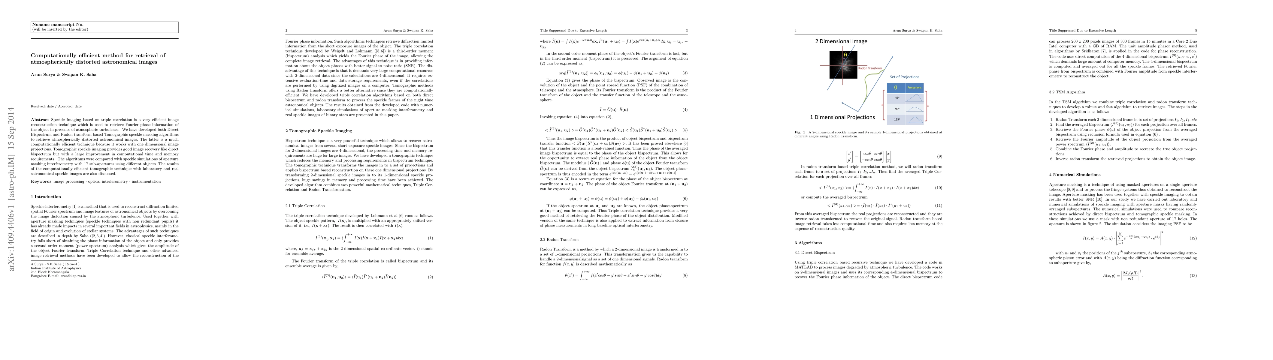 Speckle Imaging based on triple correlation is a very efficient image reconstruction technique which is used to retrieve Fourier phase information of the object in presence of atmospheric turbulence. We have developed both Direct Bispectrum and Radon transform based Tomographic speckle masking algorithms to retrieve atmospherically distorted astronomical images. The latter is a much computationally efficient technique because it works with one dimensional image projections. Tomographic speckle imaging provides good image recovery like direct bispectrum but with a large improvement in computational time and memory requirements. The algorithms were compared with speckle simulations of aperture masking interferometry with 17 sub-apertures using different objects. The results of the computationally efficient tomographic technique with laboratory and real astronomical speckle images are also discussed.