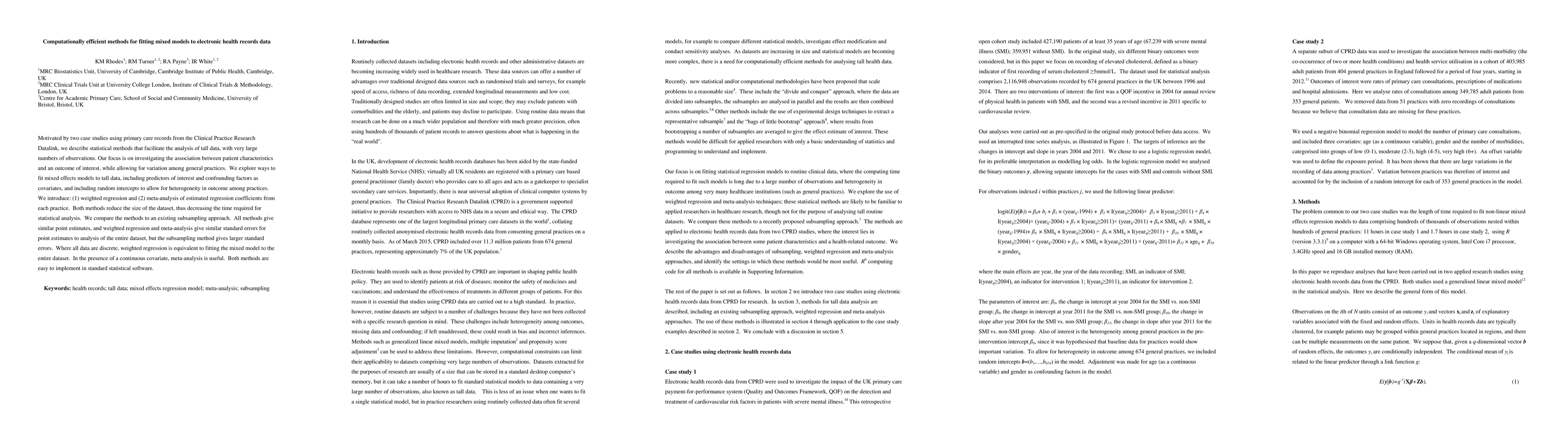 Motivated by two case studies using primary care records from the Clinical Practice Research Datalink, we describe statistical methods that facilitate the analysis of tall data, with very large numbers of observations. Our focus is on investigating the association between patient characteristics and an outcome of interest, while allowing for variation among general practices. We explore ways to fit mixed effects models to tall data, including predictors of interest and confounding factors as covariates, and including random intercepts to allow for heterogeneity in outcome among practices. We introduce: (1) weighted regression and (2) meta-analysis of estimated regression coefficients from each practice. Both methods reduce the size of the dataset, thus decreasing the time required for statistical analysis. We compare the methods to an existing subsampling approach. All methods give similar point estimates, and weighted regression and meta-analysis give similar standard errors for point estimates to analysis of the entire dataset, but the subsampling method gives larger standard errors. Where all data are discrete, weighted regression is equivalent to fitting the mixed model to the entire dataset. In the presence of a continuous covariate, meta-analysis is useful. Both methods are easy to implement in standard statistical software.