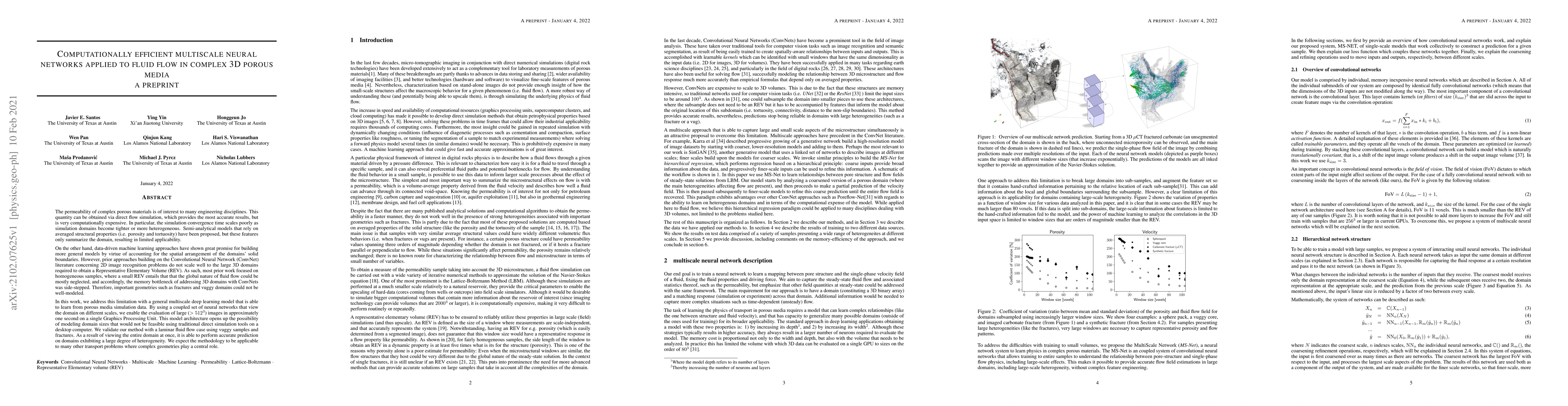 This paper proposes a computationally efficient multiscale neural network model to simulate fluid flow in complex 3D porous media, addressing the limitations of traditional direct simulation and semi-analytical models. The model leverages a coupled set of neural networks to evaluate large 3D domains rapidly, enabling the modeling of intricate geometries like fractures and vuggy domains.