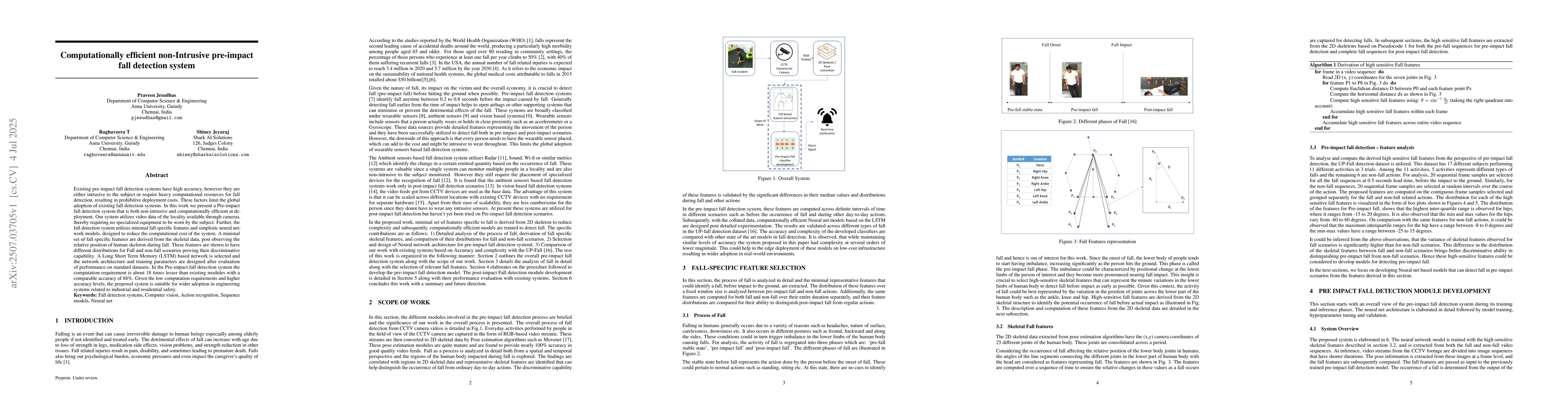 Existing pre-impact fall detection systems have high accuracy, however they are either intrusive to the subject or require heavy computational resources for fall detection, resulting in prohibitive deployment costs. These factors limit the global adoption of existing fall detection systems. In this work we present a Pre-impact fall detection system that is both non-intrusive and computationally efficient at deployment. Our system utilizes video data of the locality available through cameras, thereby requiring no specialized equipment to be worn by the subject. Further, the fall detection system utilizes minimal fall specific features and simplistic neural network models, designed to reduce the computational cost of the system. A minimal set of fall specific features are derived from the skeletal data, post observing the relative position of human skeleton during fall. These features are shown to have different distributions for Fall and non-fall scenarios proving their discriminative capability. A Long Short Term Memory (LSTM) based network is selected and the network architecture and training parameters are designed after evaluation of performance on standard datasets. In the Pre-impact fall detection system the computation requirement is about 18 times lesser than existing modules with a comparable accuracy of 88%. Given the low computation requirements and higher accuracy levels, the proposed system is suitable for wider adoption in engineering systems related to industrial and residential safety.