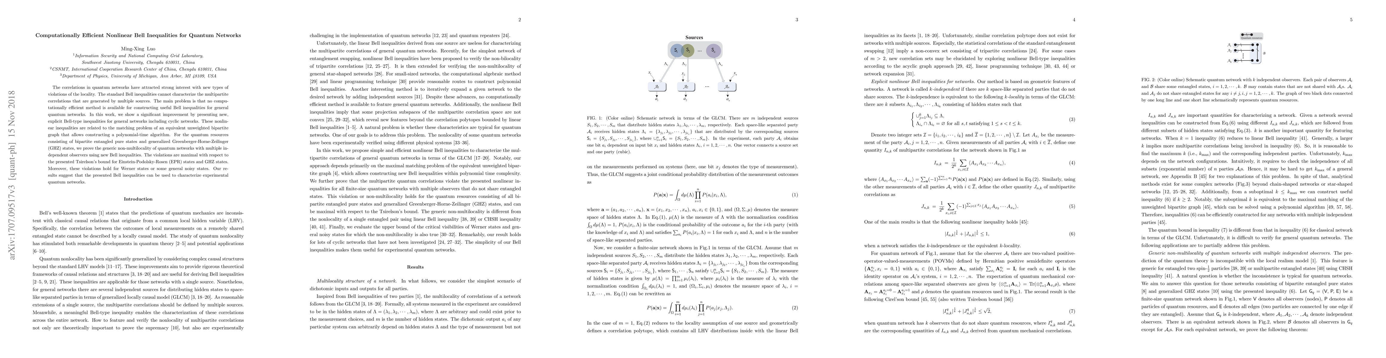 This paper presents new computationally efficient nonlinear Bell inequalities for general quantum networks, addressing the challenge of characterizing multipartite correlations. The proposed Bell-type inequalities, derived from the matching problem of an unweighted bipartite graph, enable a polynomial-time algorithm and demonstrate maximal violations for quantum resources, suggesting practical applicability for experimental quantum networks.