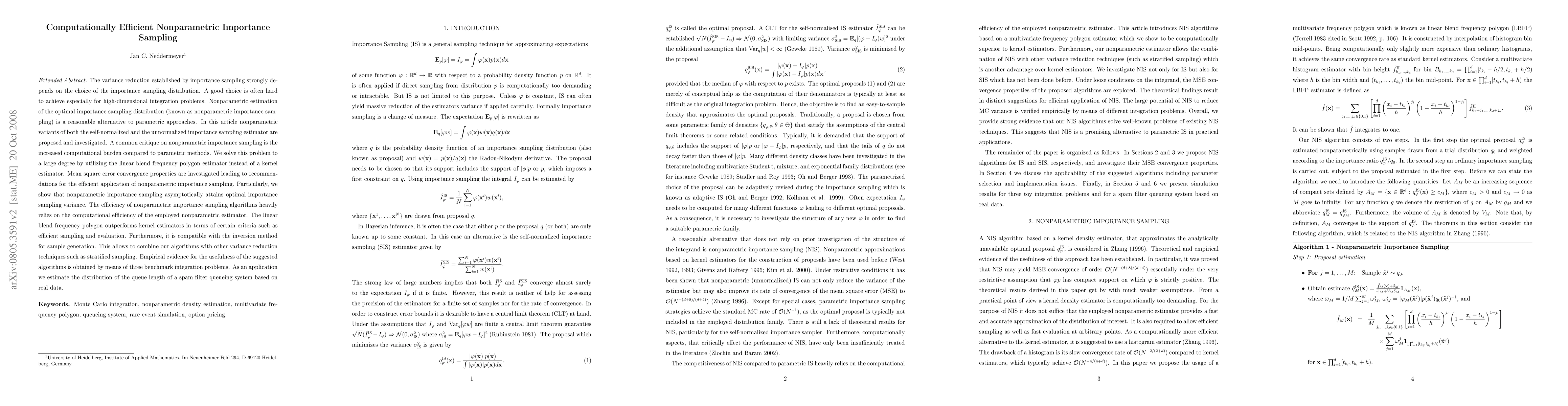 This paper proposes computationally efficient nonparametric importance sampling methods, using linear blend frequency polygon estimators to reduce computational burden compared to kernel estimators. The authors demonstrate that these methods achieve optimal importance sampling variance and can be combined with other variance reduction techniques.
