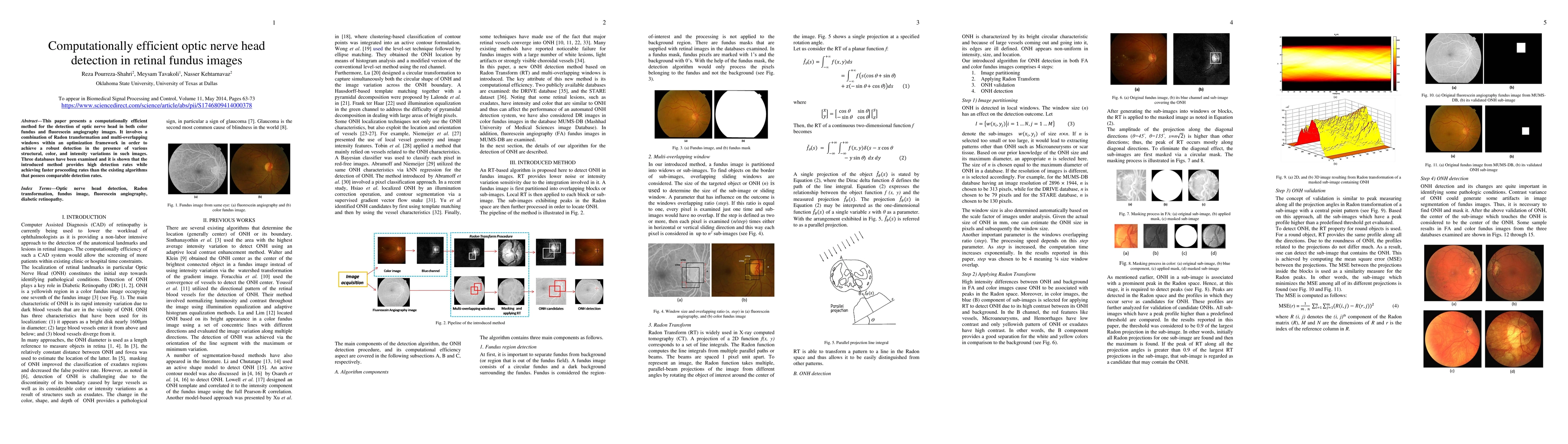 This paper introduces a computationally efficient method for optic nerve head detection in retinal fundus images using Radon transformation and multi-overlapping windows, achieving high detection rates and faster processing compared to existing algorithms. The method was tested on three databases, demonstrating its robustness against various image variations.