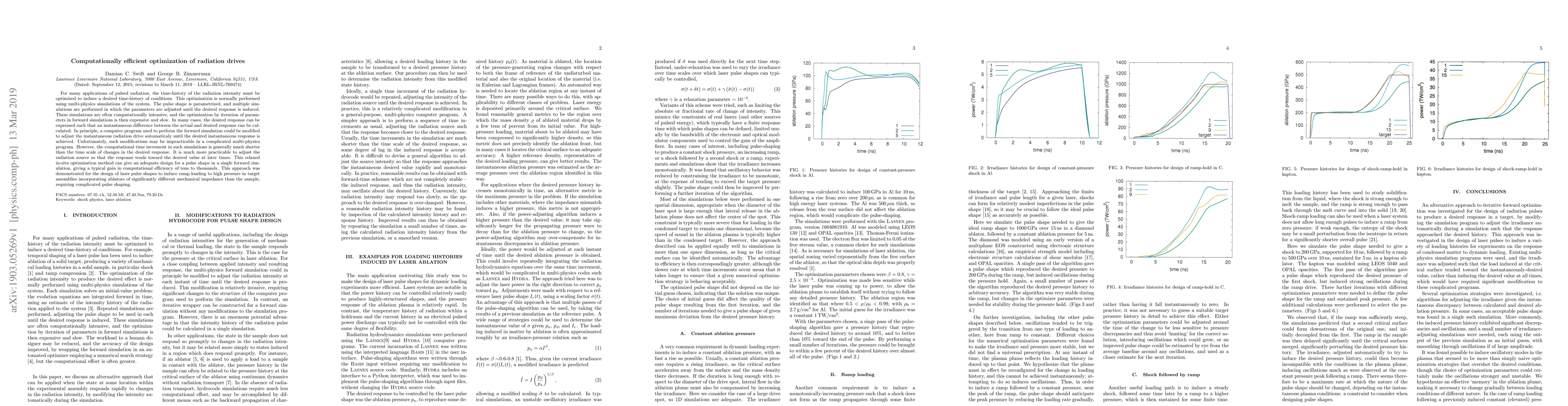 For many applications of pulsed radiation, the time-history of the radiation intensity must be optimized to induce a desired time-history of conditions. This optimization is normally performed using multi-physics simulations of the system. The pulse shape is parametrized, and multiple simulations are performed in which the parameters are adjusted until the desired response is induced. These simulations are often computationally intensive, and the optimization by iteration of parameters in forward simulations is then expensive and slow. In many cases, the desired response can be expressed such that an instantaneous difference between the actual and desired response can be calculated. In principle, a computer program used to perform the forward simulation could be modified to adjust the instantaneous radiation drive automaticaly until the desired instantaneous response is achieved. Unfortunately, such modifications may be impracticable in a complicated multi-physics program. However, the computational time increment in such simulations is generally much shorter than the time scale of changes in the desired response. It is much more practicable to adjust the radiation source so that the response tends toward the desired value at later times. This relaxed in-situ optimization method can give an adequate design for a pulse shape in a single forward simulation, giving a typical gain in computational efficiency of tens to thousands. This approach was demonstrated for the design of laser pulse shapes to induce ramp loading to high pressure in target assemblies incorporating ablators of significantly different mechanical impedance than the sample, requiring complicated pulse shaping.