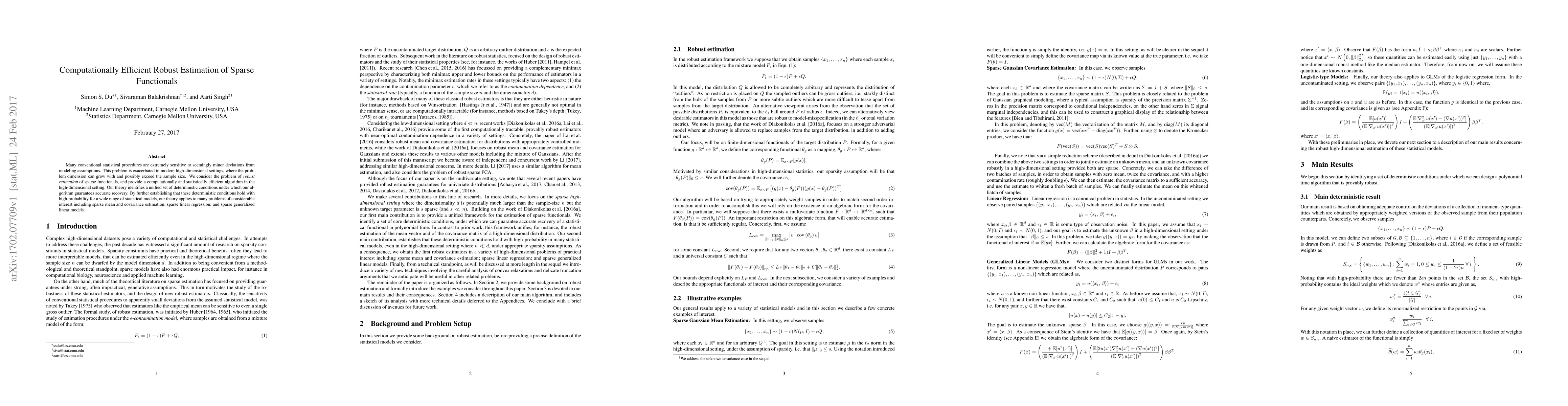 This paper presents a computationally efficient algorithm for robust estimation of sparse functionals in high-dimensional settings, ensuring accurate recovery under deterministic conditions that hold with high probability across various statistical models, including sparse mean and covariance estimation, and sparse regression.