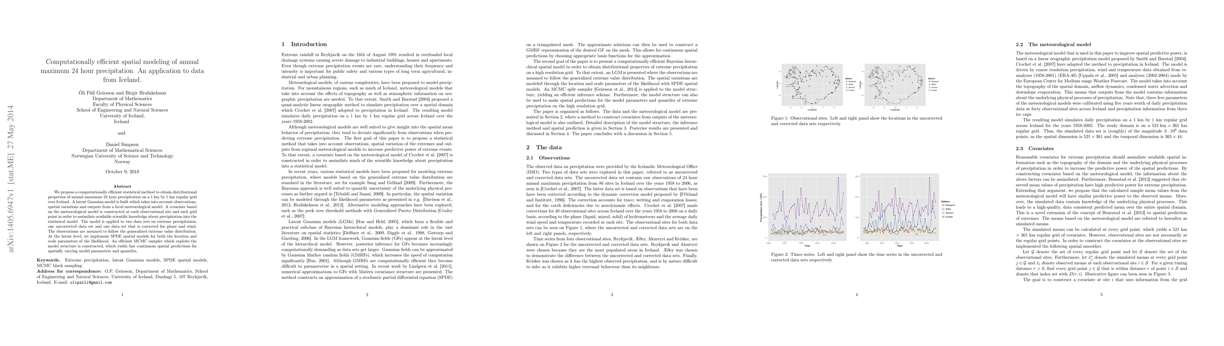This paper introduces a computationally efficient statistical method for modeling annual maximum 24-hour precipitation over Iceland on a 1 km grid. It employs a latent Gaussian model integrating meteorological data and uses SPDE spatial models for fast MCMC sampling, enabling continuous spatial predictions of precipitation extremes.