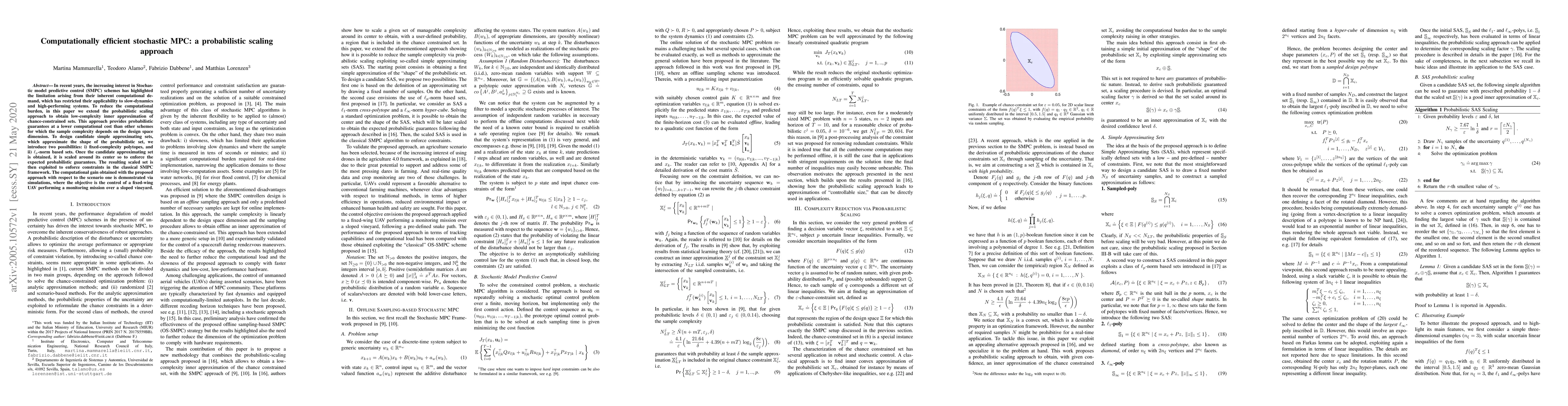 In recent years, the increasing interest in Stochastic model predictive control (SMPC) schemes has highlighted the limitation arising from their inherent computational demand, which has restricted their applicability to slow-dynamics and high-performing systems. To reduce the computational burden, in this paper we extend the probabilistic scaling approach to obtain low-complexity inner approximation of chance-constrained sets. This approach provides probabilistic guarantees at a lower computational cost than other schemes for which the sample complexity depends on the design space dimension. To design candidate simple approximating sets, which approximate the shape of the probabilistic set, we introduce two possibilities: i) fixed-complexity polytopes, and ii) $\ell_p$-norm based sets. Once the candidate approximating set is obtained, it is scaled around its center so to enforce the expected probabilistic guarantees. The resulting scaled set is then exploited to enforce constraints in the classical SMPC framework. The computational gain obtained with the proposed approach with respect to the scenario one is demonstrated via simulations, where the objective is the control of a fixed-wing UAV performing a monitoring mission over a sloped vineyard.