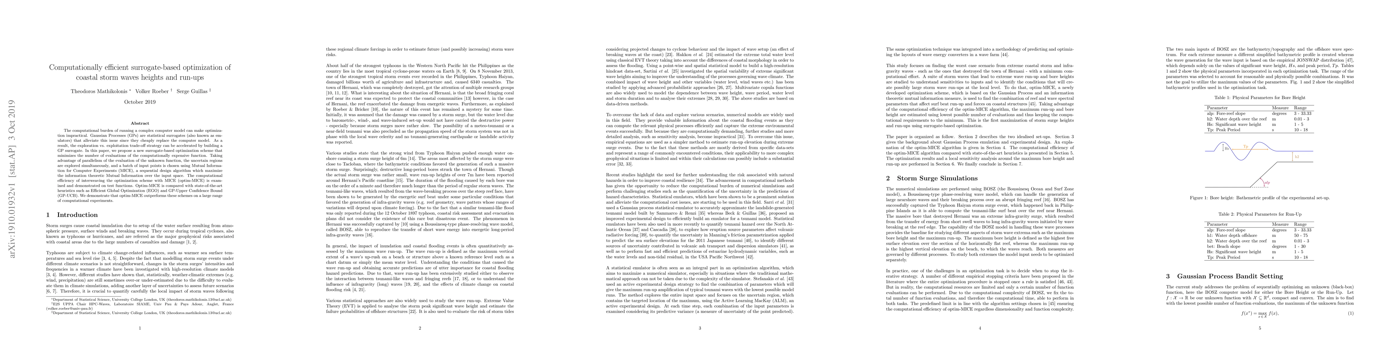 Storm surges cause coastal inundations due to the setup of the water surface resulting from atmospheric pressure, surface winds and breaking waves. The latter is particularly difficult to be accounted for. For instance, it was observed that during Typhoon Haiyan (2013, Philippines), a stretch of coral reef near the coast, which was expected to protect the coastal communities, actually amplified the waves. The propagation and breaking process of such large nearshore waves can be successfully captured by a phase-resolving wave model. Building defences requires estimating not only the maximum storm surge height, but also maxima of breaking wave height and run-up on land, under consideration of a variety of storm characteristics. However, the computational complexity of the simulator makes optimization tasks impractical. To find the maximum breaking wave (bore) height and the maximum run-up, we employ optim-MICE, a new surrogate-based optimization scheme based on Gaussian Process emulation and information theory. In two idealised settings, we efficiently identify the conditions that create the largest storm waves at the coast using a minimal number of simulations. This is the first surrogate-based optimization of storm waves. It opens the door to previously inconceivable coastal risk assessments.