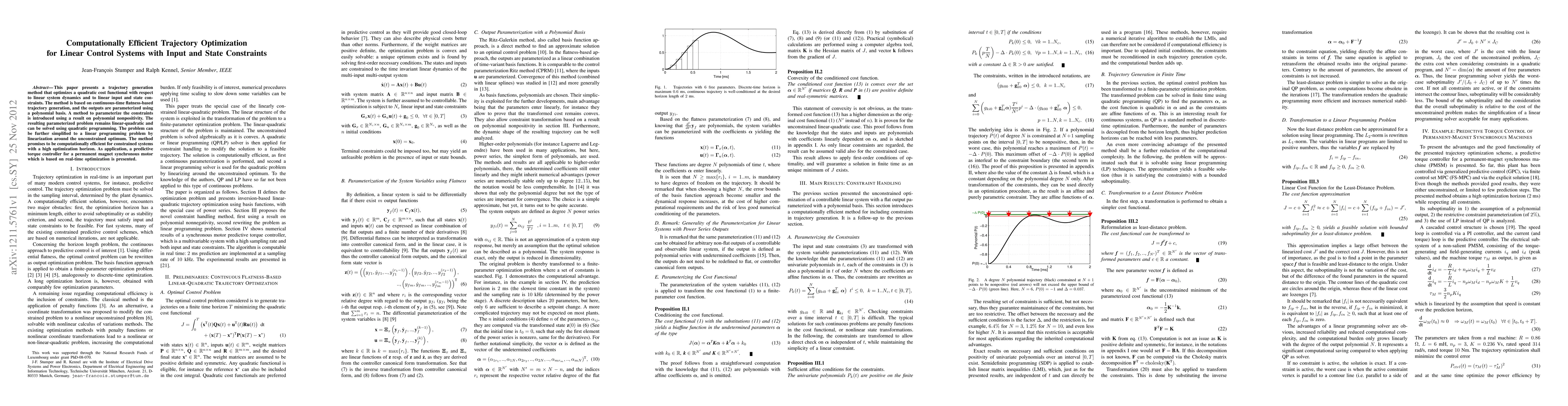 This paper proposes a computationally efficient trajectory optimization method for linear control systems with input and state constraints, utilizing polynomial parameterization and flatness-based generation. The method simplifies to linear programming, enabling real-time optimization, as demonstrated in a predictive torque controller for a motor.