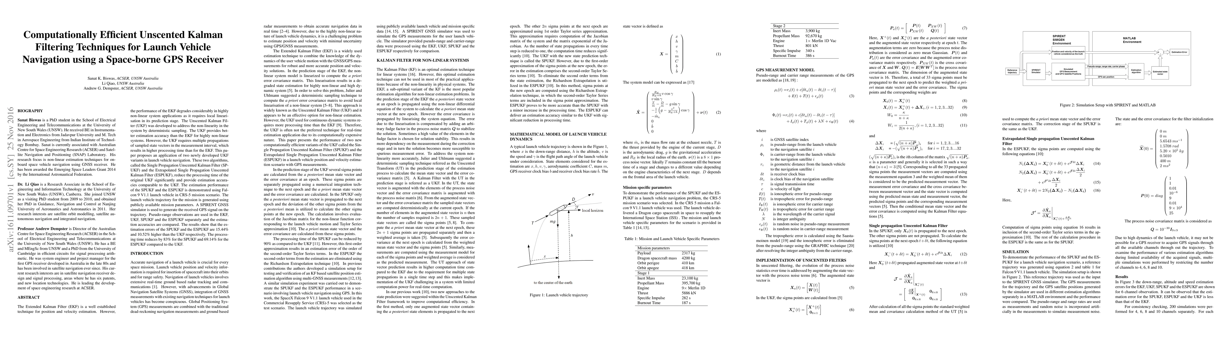 This paper proposes computationally efficient variants of the Unscented Kalman Filter (SPUKF and ESPUKF) for launch vehicle navigation using space-borne GPS receivers. These variants significantly reduce processing time while maintaining estimation accuracy comparable to the original UKF, demonstrating improved performance in a Falcon 9 V1.1 launch vehicle scenario.