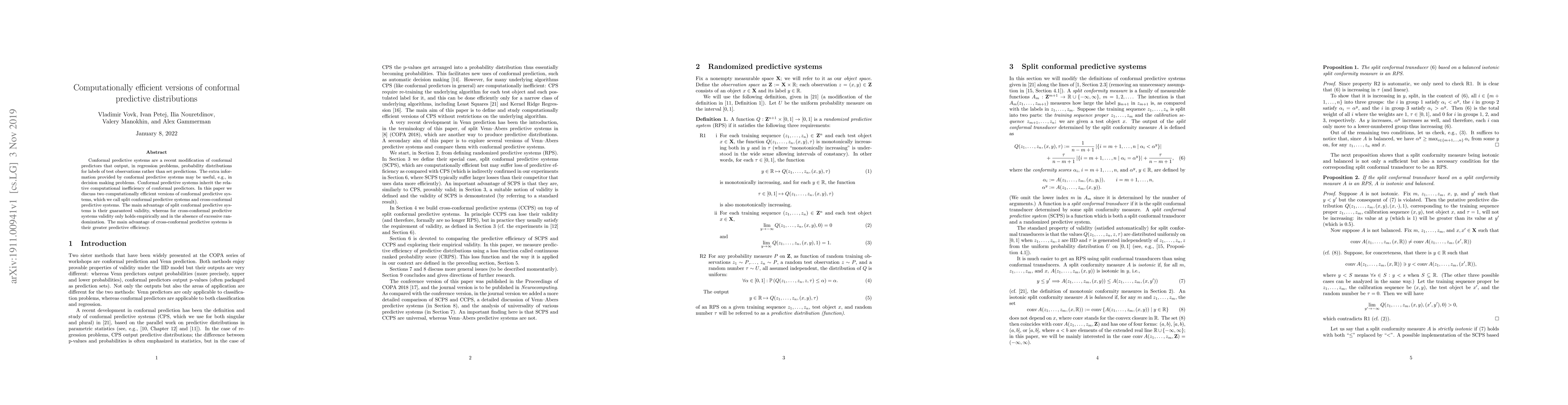 This paper introduces two computationally efficient versions of conformal predictive systems: split conformal predictive systems and cross-conformal predictive systems. Split systems guarantee validity but are less efficient, while cross-conformal systems are more efficient but only empirically valid.