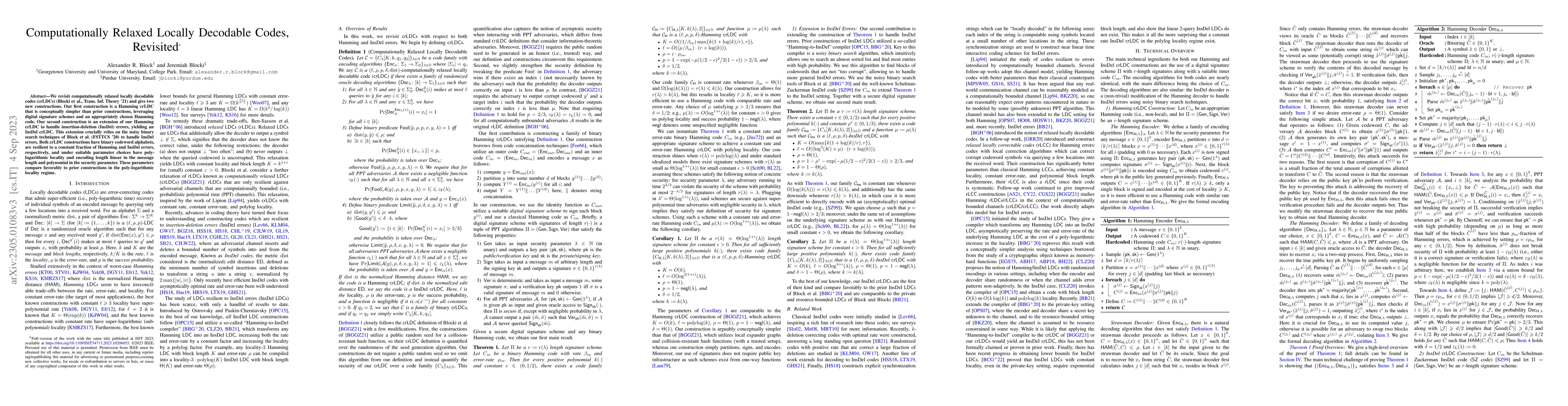 The paper revisits computationally relaxed locally decodable codes (crLDCs) and presents two new constructions: a Hamming crLDC and an extension to handle insertion-deletion (InsDel) errors, yielding an InsDel crLDC.