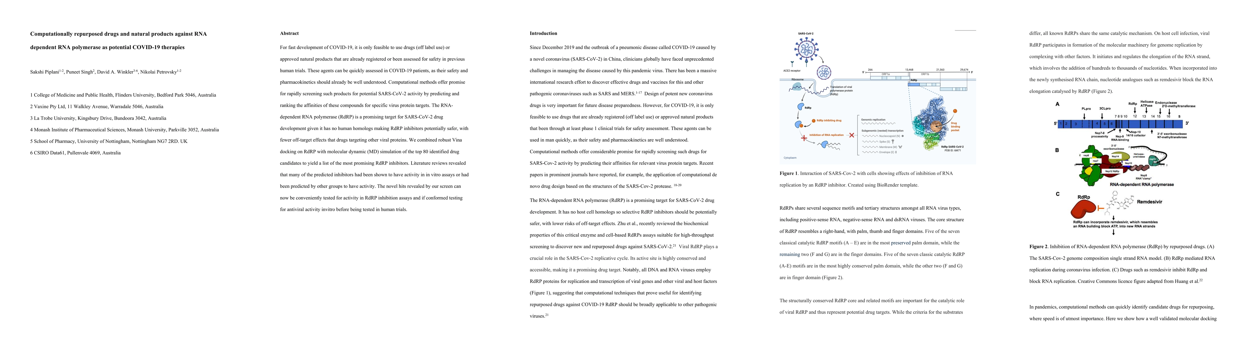 For fast development of COVID-19, it is only feasible to use drugs (off label use) or approved natural products that are already registered or been assessed for safety in previous human trials. These agents can be quickly assessed in COVID-19 patients, as their safety and pharmacokinetics should already be well understood. Computational methods offer promise for rapidly screening such products for potential SARS-CoV-2 activity by predicting and ranking the affinities of these compounds for specific virus protein targets. The RNA-dependent RNA polymerase (RdRP) is a promising target for SARS-CoV-2 drug development given it has no human homologs making RdRP inhibitors potentially safer, with fewer off-target effects that drugs targeting other viral proteins. We combined robust Vina docking on RdRP with molecular dynamic (MD) simulation of the top 80 identified drug candidates to yield a list of the most promising RdRP inhibitors. Literature reviews revealed that many of the predicted inhibitors had been shown to have activity in in vitro assays or had been predicted by other groups to have activity. The novel hits revealed by our screen can now be conveniently tested for activity in RdRP inhibition assays and if conformed testing for antiviral activity invitro before being tested in human trials