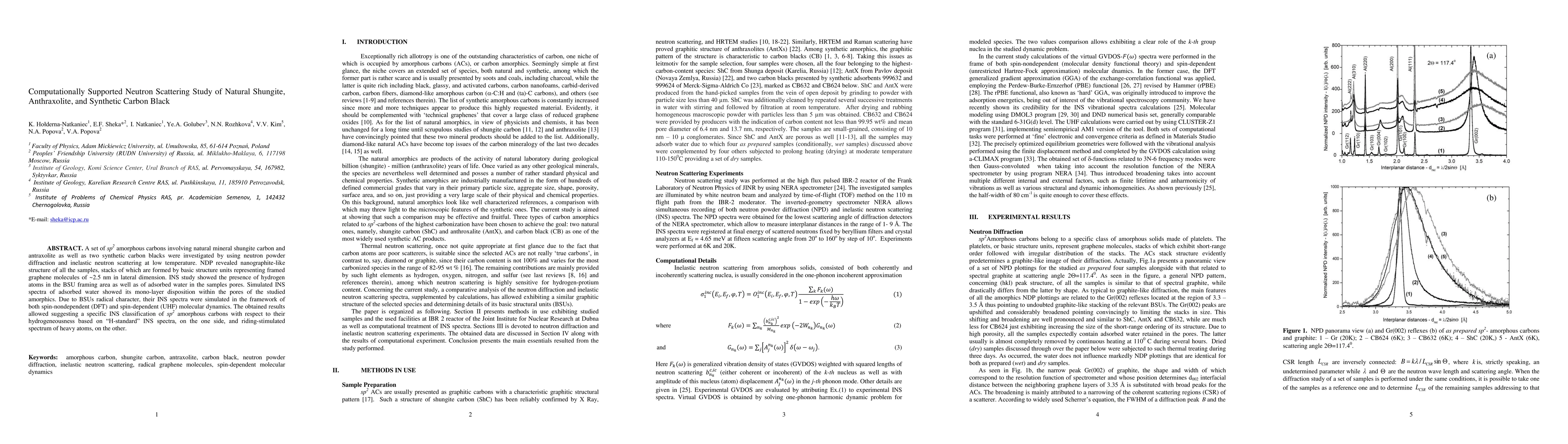 This study uses neutron scattering techniques to analyze sp2 amorphous carbons, including natural shungite and anthracite alongside synthetic carbon blacks, revealing their nanographite-like structures and identifying hydrogen atoms and adsorbed water within their frameworks. Simulation results suggest a new INS classification for these materials based on hydrogen content.