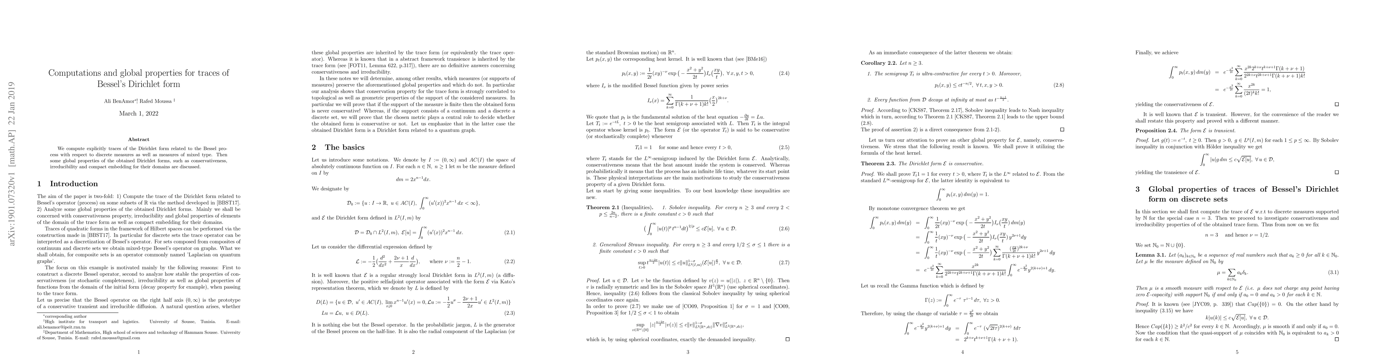 This paper computes the traces of Bessel's Dirichlet form concerning discrete and mixed measures and discusses global properties like conservativeness, irreducibility, and compact embedding of their domains.