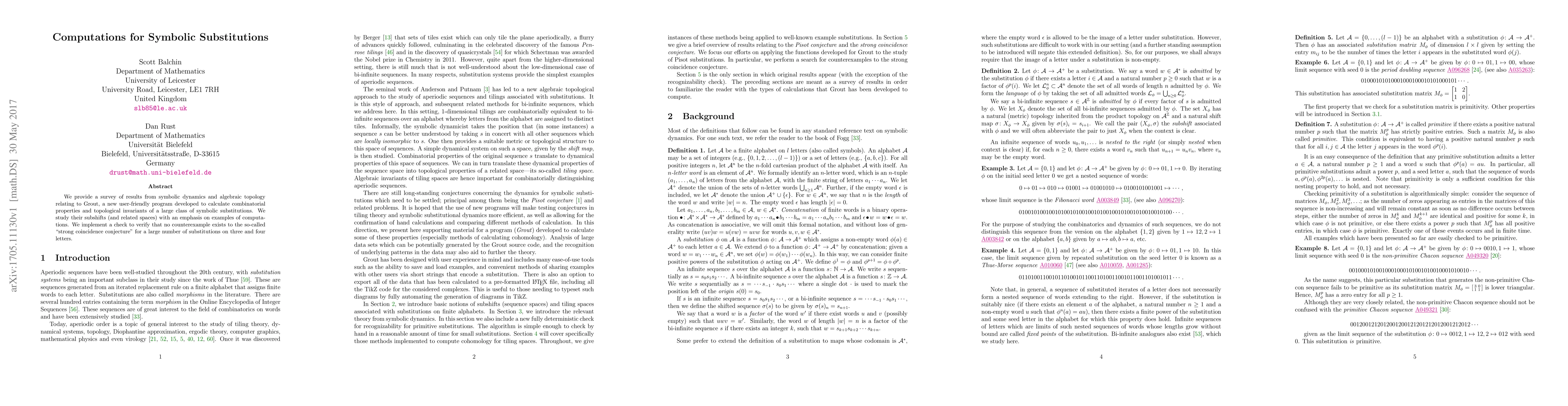 This paper surveys results from symbolic dynamics and algebraic topology using Grout, a new program for calculating combinatorial properties and topological invariants of symbolic substitutions. It verifies the "strong coincidence conjecture" for many three and four-letter substitutions through computational examples.