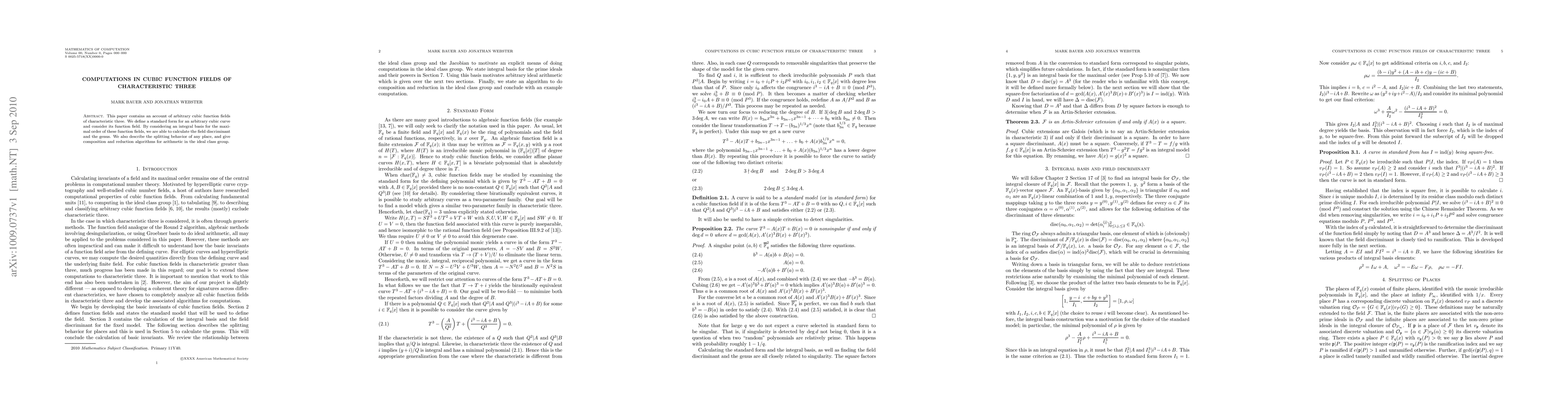 This paper explores cubic function fields in characteristic three, defining a standard form for cubic curves and determining their function fields' discriminants and genus. It also outlines algorithms for place splitting behavior and arithmetic in the ideal class group.