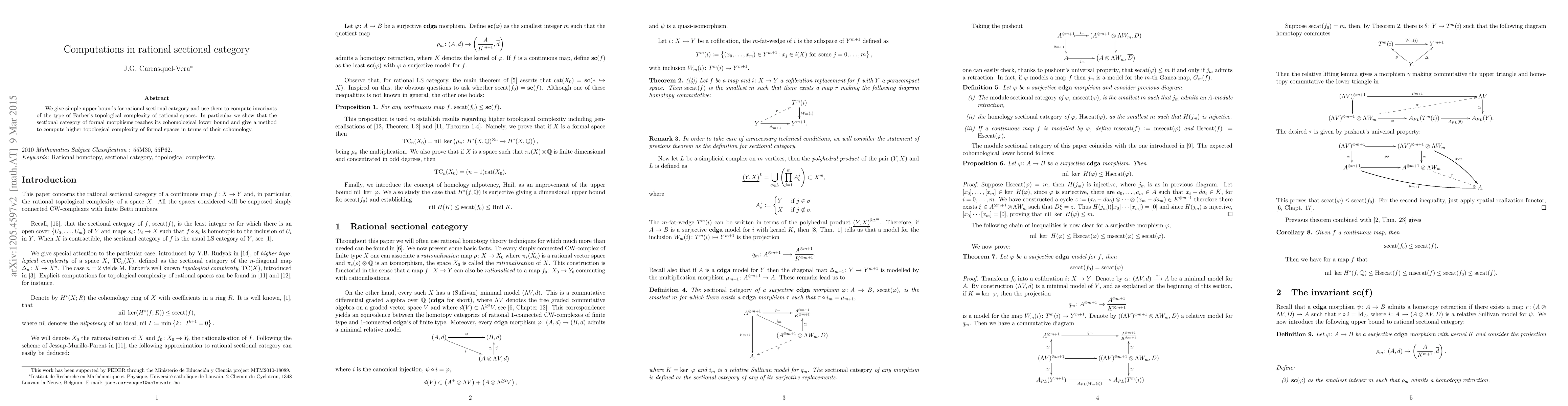 This paper provides upper bounds for rational sectional category and applies them to compute Farber's topological complexity for rational spaces, demonstrating that the sectional category of formal morphisms achieves its cohomological lower bound and offering a method to determine higher topological complexity via cohomology.