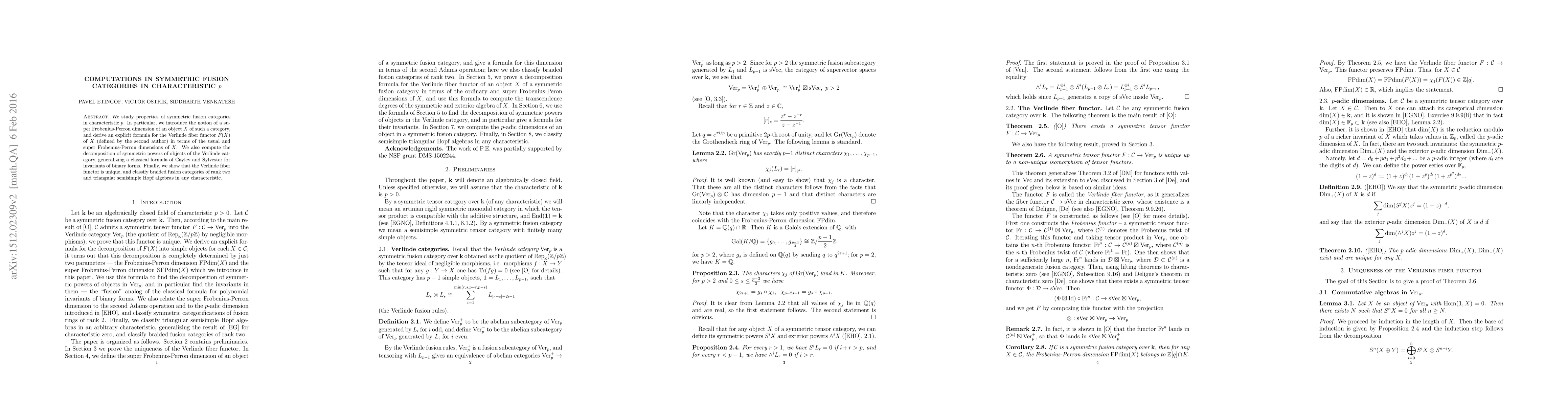 This paper explores symmetric fusion categories in characteristic $p$, introducing the super Frobenius-Perron dimension and deriving a formula for the Verlinde fiber functor. It also generalizes classical formulas for symmetric powers and classifies certain braided fusion categories and Hopf algebras.