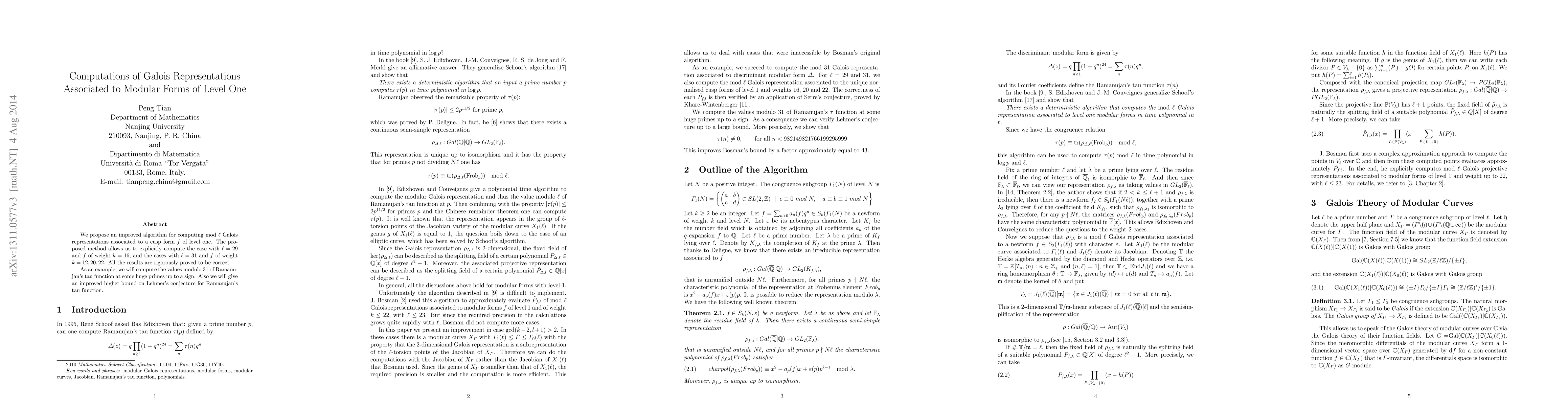 We propose an improved algorithm for computing mod $\ell$ Galois representations associated to a cusp form $f$ of level one. The proposed method allows us to explicitly compute the case with $\ell=29$ and $f$ of weight $k=16$, and the cases with $\ell=31$ and $f$ of weight $k=12,20, 22$. All the results are rigorously proved to be correct. As an example, we will compute the values modulo $31$ of Ramanujan's tau function at some huge primes up to a sign. Also we will give an improved higher bound on Lehmer's conjecture for Ramanujan's tau function.