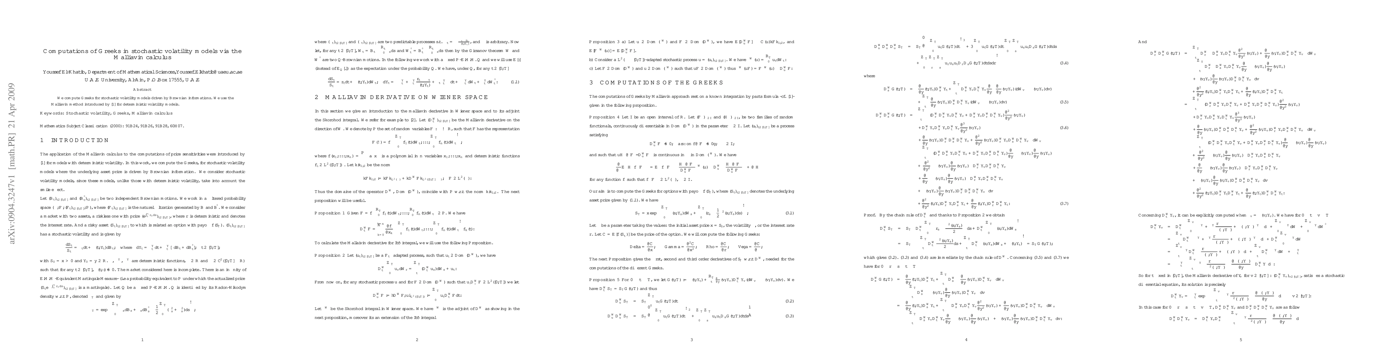 Summary: This paper computes Greeks for stochastic volatility models using the Malliavin calculus, extending the method previously applied to deterministic volatility models. The approach leverages Brownian information to derive the necessary derivatives.