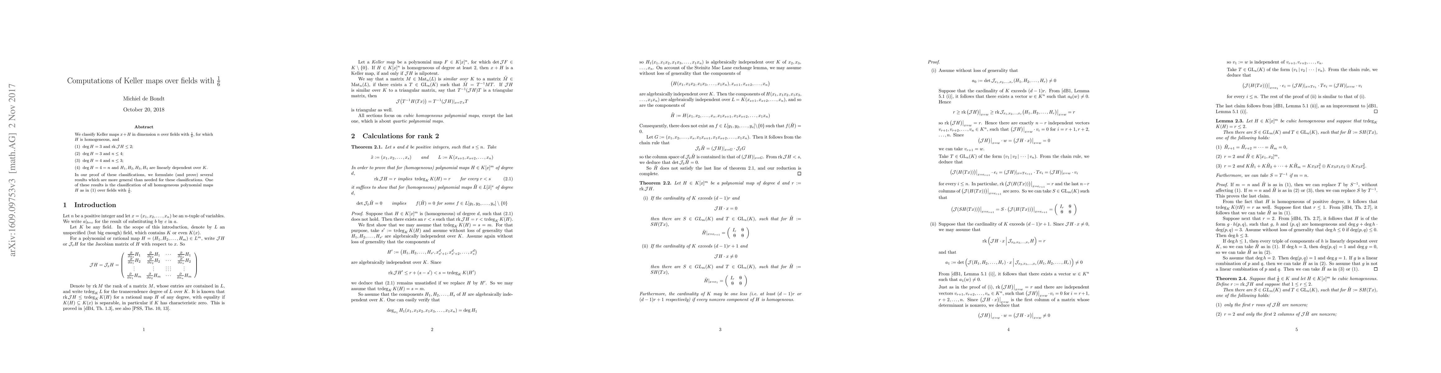 This paper classifies Keller maps $x + H$ over fields with $\tfrac16$ under various conditions on the degree and rank of the homogeneous polynomial $H$. It also proves several more general results, including the classification of all relevant homogeneous polynomial maps $H$.