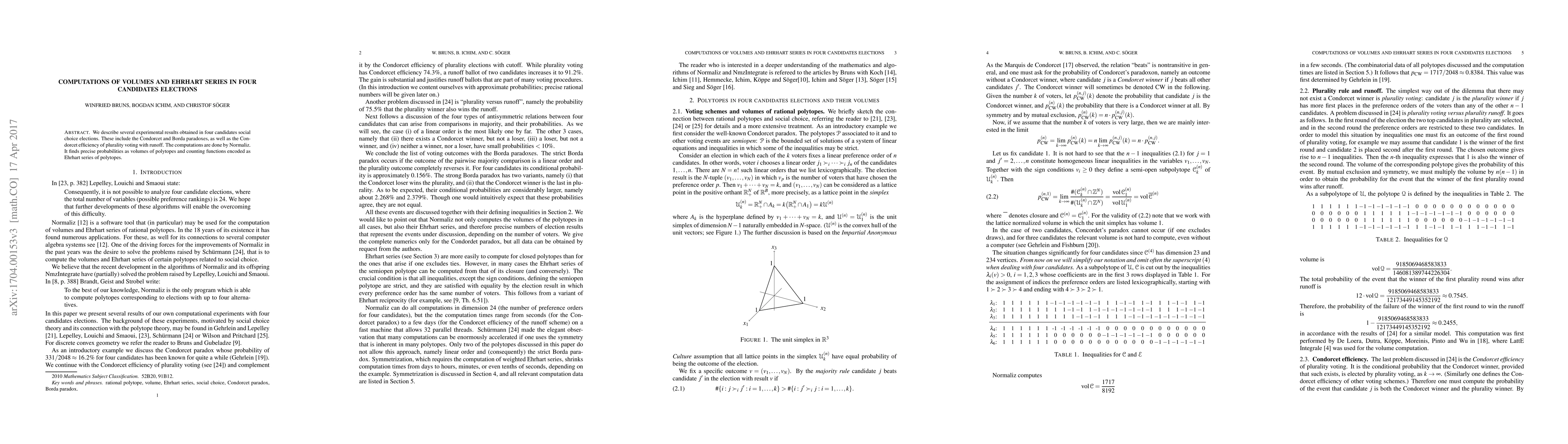 We describe several experimental results obtained in four candidates social choice elections. These include the Condorcet and Borda paradoxes, as well as the Condorcet efficiency of plurality voting with runoff. The computations are done by Normaliz. It finds precise probabilities as volumes of polytopes and counting functions encoded as Ehrhart series of polytopes.