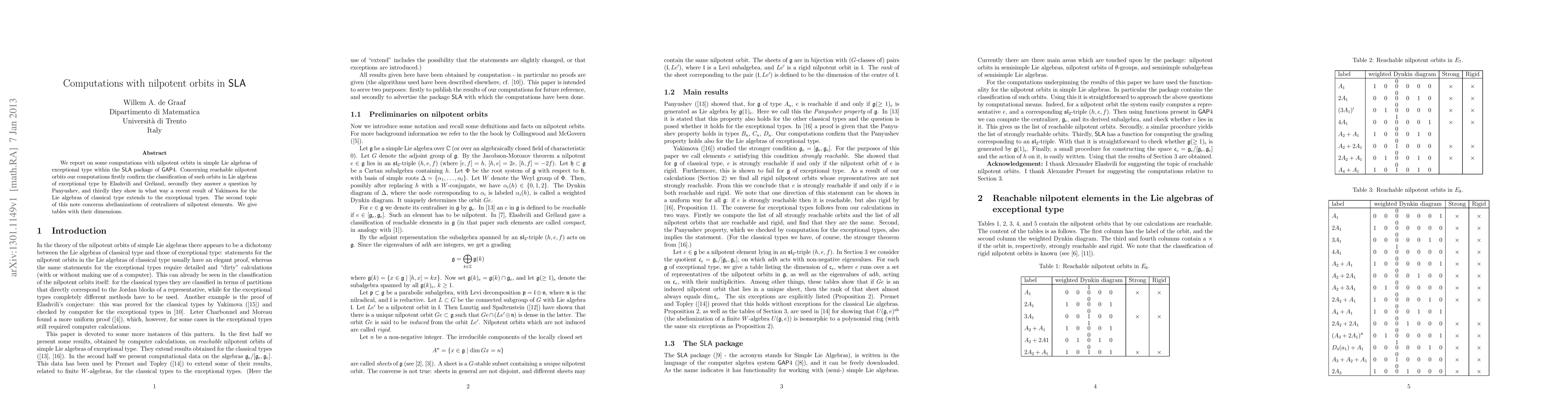 We report on some computations with nilpotent orbits in simple Lie algebras of exceptional type within the SLA package of GAP4. Concerning reachable nilpotent orbits our computations firstly confirm the classification of such orbits in Lie algebras of exceptional type by Elashvili and Grelaud, secondly they answer a question by Panyushev, and thirdly they show in what way a recent result of Yakimova for the Lie algebras of classical type extends to the exceptional types. The second topic of this note concerns abelianizations of centralizers of nilpotent elements. We give tables with their dimensions.