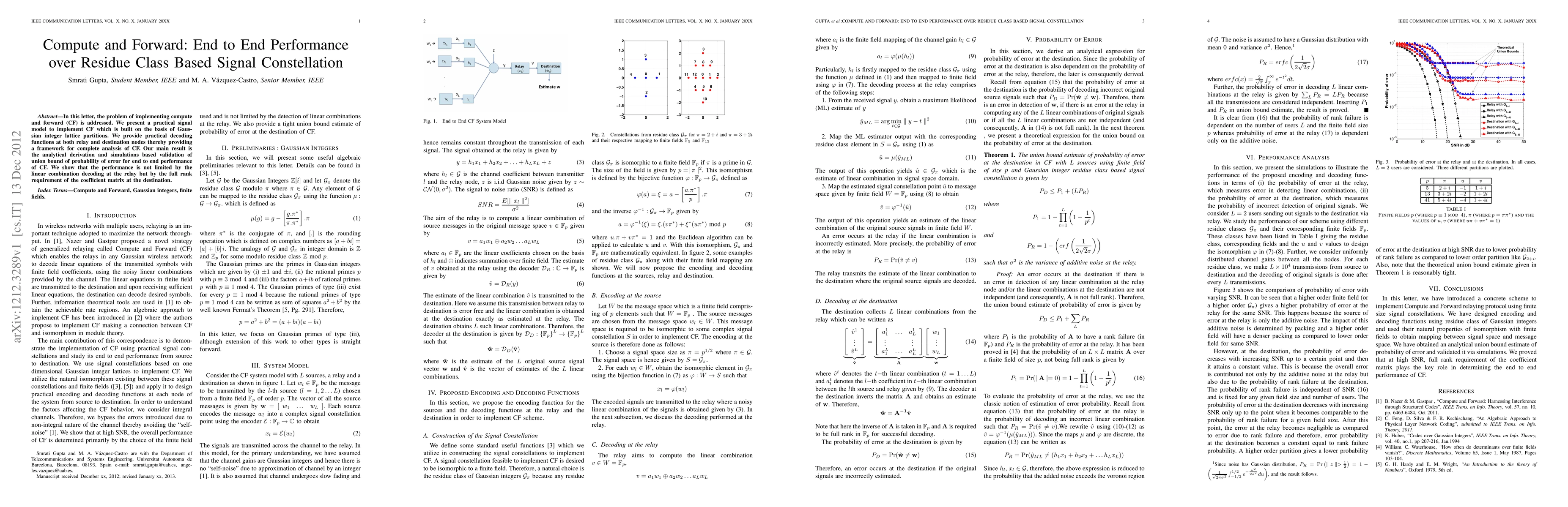In this letter, the problem of implementing compute and forward (CF) is addressed. We present a practical signal model to implement CF which is built on the basis of Gaussian integer lattice partitions. We provide practical decoding functions at both relay and destination nodes thereby providing a framework for complete analysis of CF. Our main result is the analytical derivation and simulations based validation of union bound of probability of error for end to end performance of CF. We show that the performance is not limited by the linear combination decoding at the relay but by the full rank requirement of the coefficient matrix at the destination.