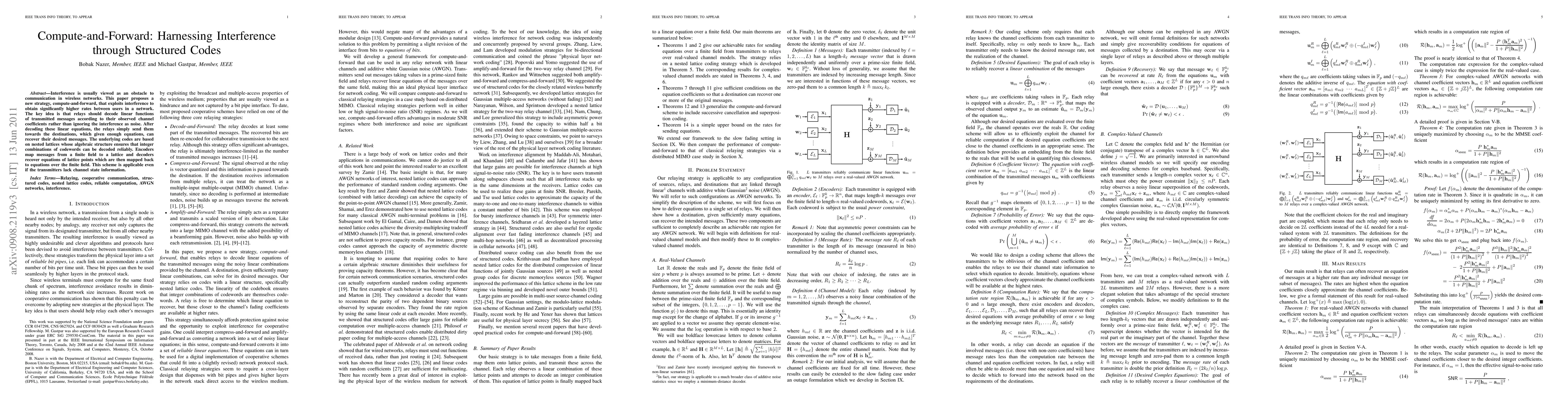 This paper proposes the compute-and-forward strategy to leverage interference in wireless networks for higher communication rates by having relays decode linear functions of transmitted messages based on channel coefficients. The method uses nested lattices to ensure reliable decoding of integer combinations, enabling message recovery even without channel state information.