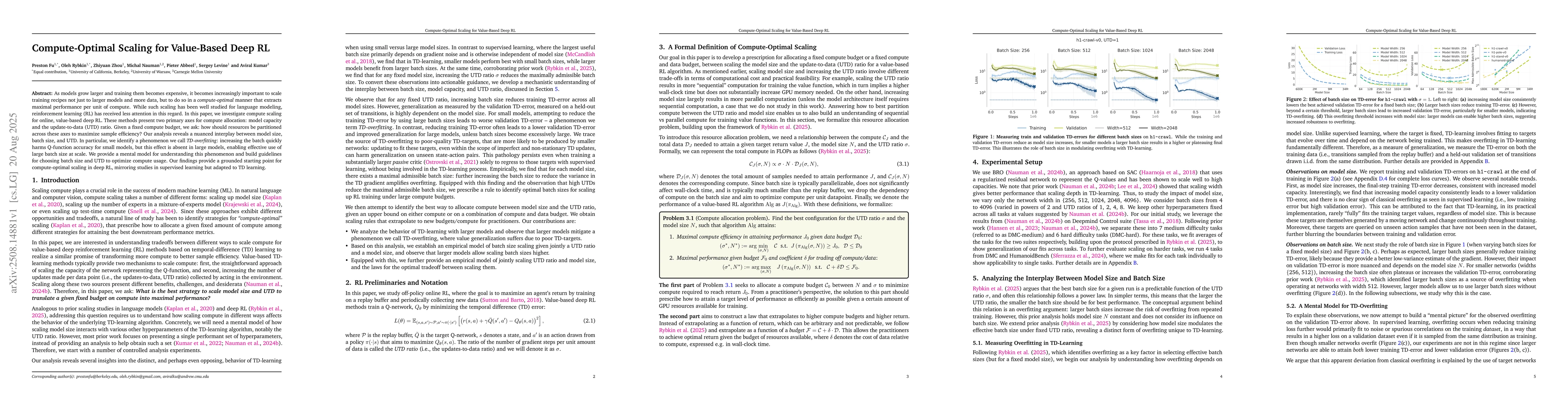 This paper investigates compute scaling for online, value-based deep reinforcement learning (RL) by analyzing the interplay between model size, batch size, and UTD ratio within a fixed compute budget. The study identifies a phenomenon called TD-overfitting, where large batch sizes harm Q-function accuracy for small models but are effective for large models.